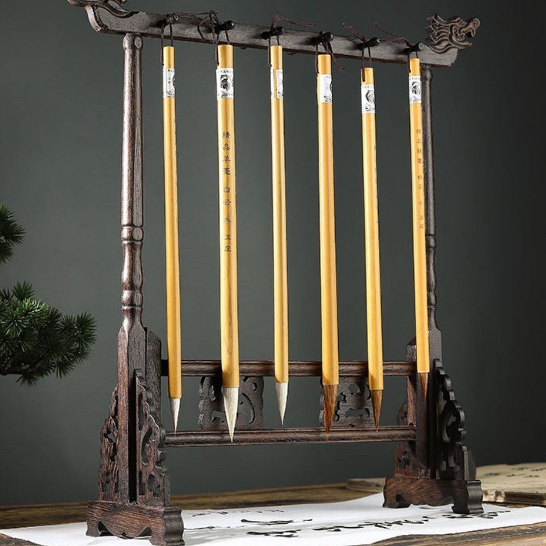 掛けられる筆の本数は突起した棒に12本、龍の口に2本の14本になります。