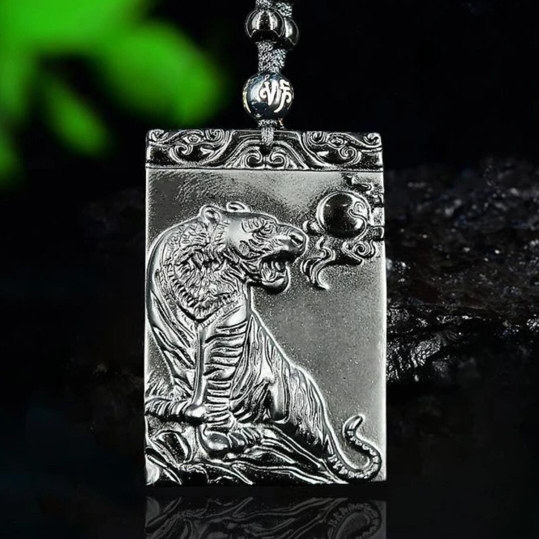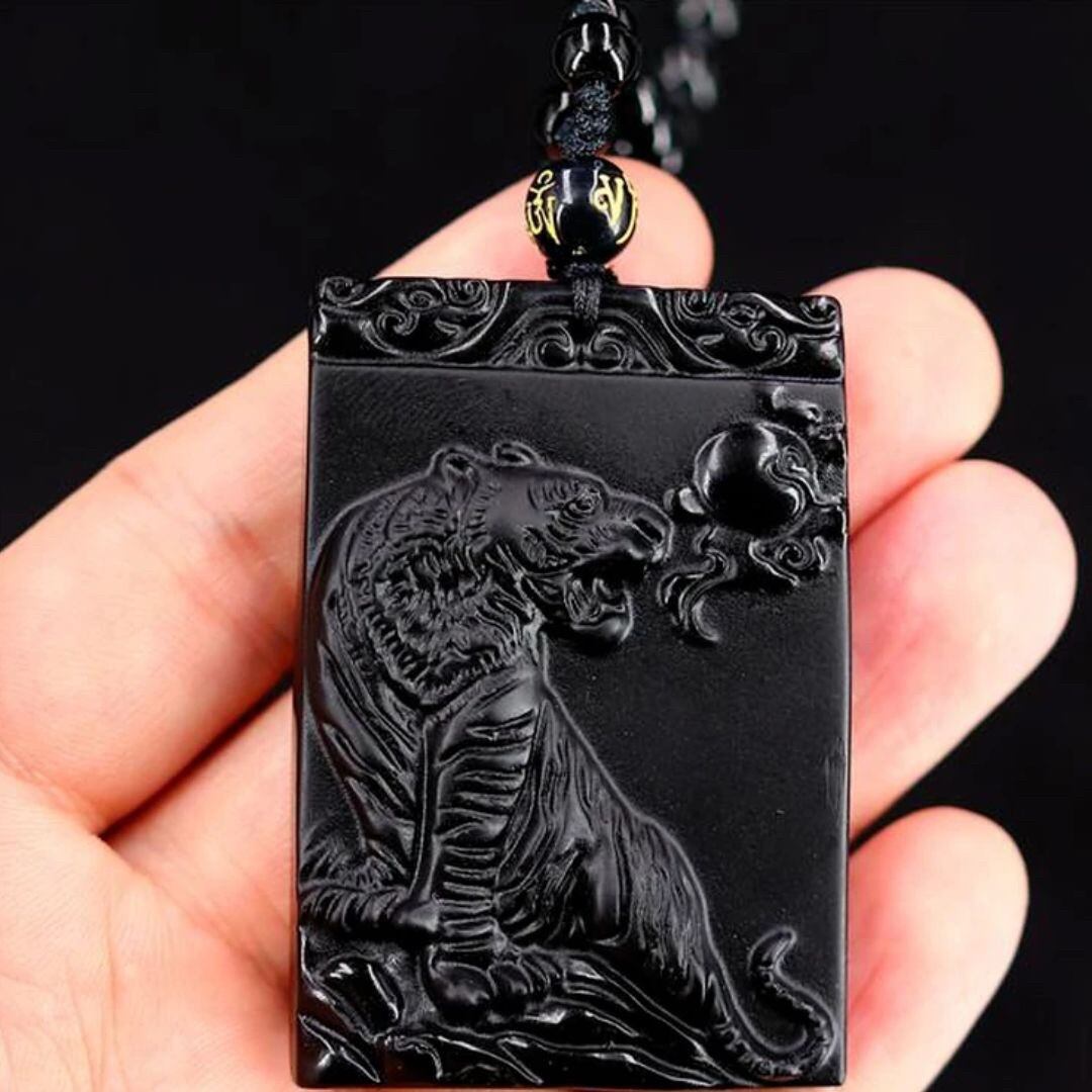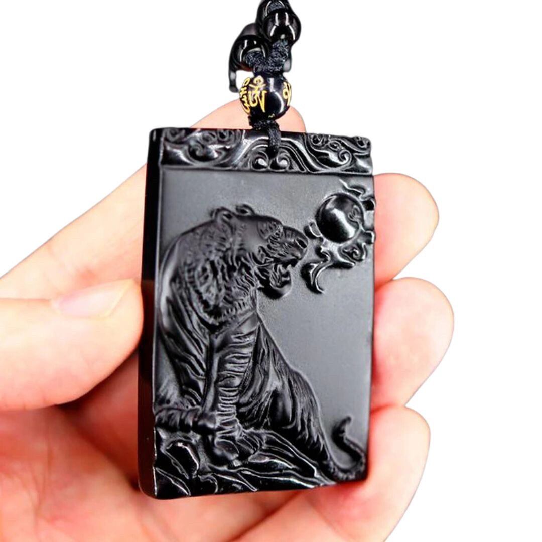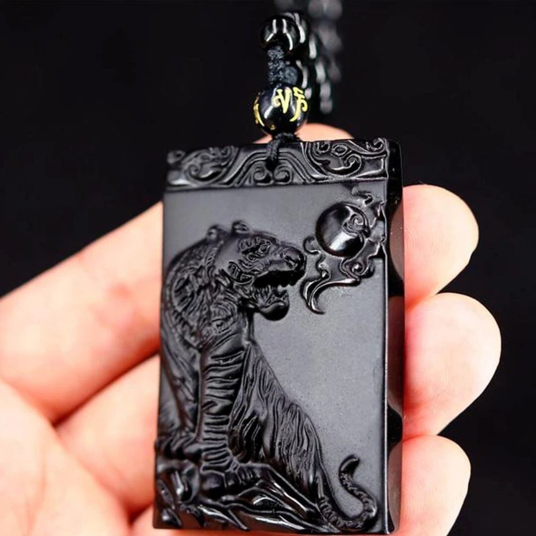 ネックレス 黒数珠 四角板 虎 タイガー 黒虎 首輪 紐 アクセサリー お守り 厄除け 魔除け 数珠