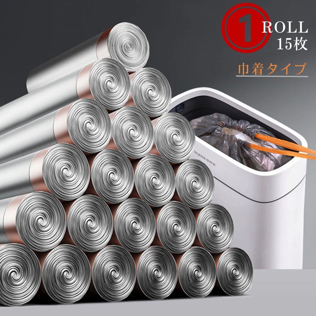 ごみ袋 巾着紐 容量アップ 1ロール(15枚入り) 半透明 ブラック 破れにくい 手間なし 汚れなし