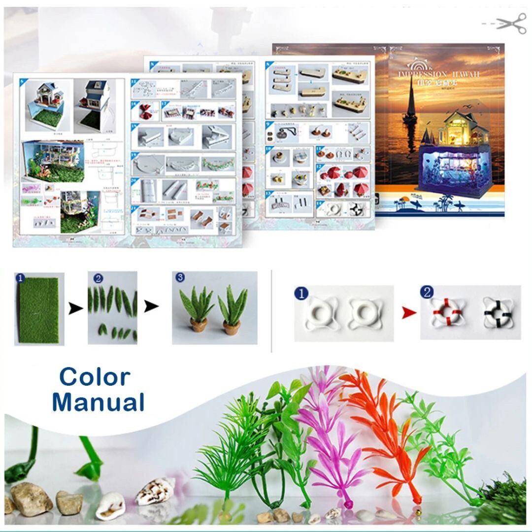 このLEDライト付きのミニチュアドールハウスは、ベッド、ソファ、窓、ランプ、植物など、多くの部品を使ってあなただけのおしゃれな海の家を作ることができます。