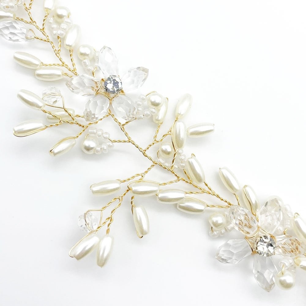 ブライダル ヘアアクセサリー 花ジュエリー 結婚式サイズ約23cm×約5cm×約0.5cm重量 約20g素材 人工パール、人工クリスタル、ワイヤー*こちらの商品は留めるピンや紐などは付いておらずジュエリーのみの販売となりますのでご了承の上ご購入ください*装着する際はご自身で留金や紐を付けるなどしてアレンジしてお使いください洋の雰囲気がプレ花嫁さんに大人気!