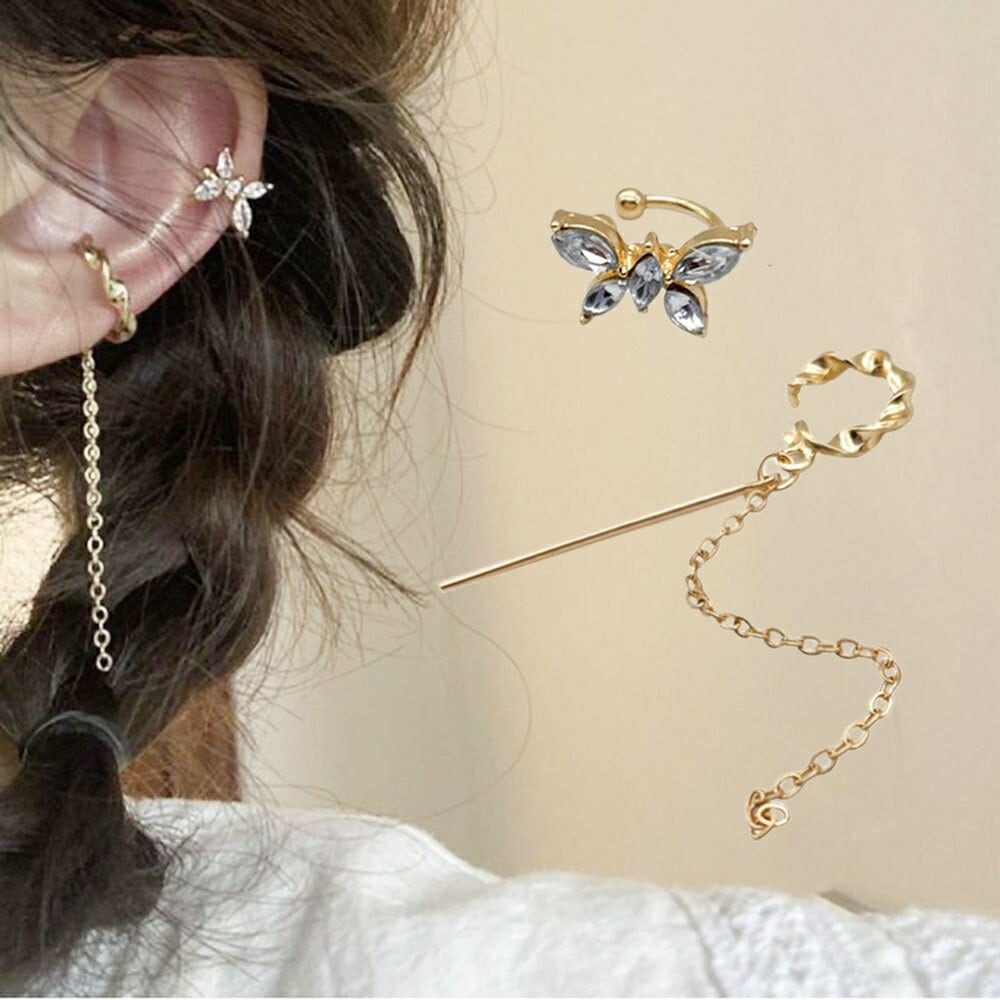 サイズ蝶々部分横約1.3cm×縦約0.8cm×厚さ約1cm棒状リング型部分リング 直径約1.5cm棒長さ約3.5cmチェーン長さ約6.5cm(イヤーカフですので挟む幅はある程度調節可能です)重量 3g素材 合金