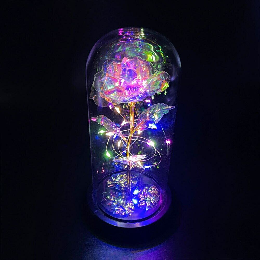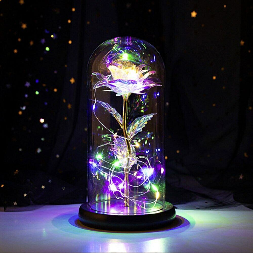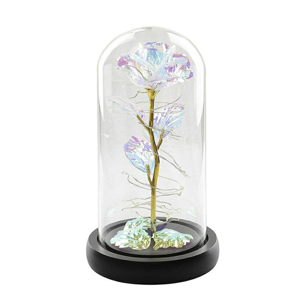 眺めているだけで幸せな気分になってきますバラの花言葉は、「貴方はあくまで私のもの」「決して滅びることのない愛」「永遠の愛」「真実の愛」という意味になります透き通るギャラクシーカラーの薔薇のLEDガラスドームです。