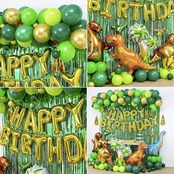 大きな恐竜(ティラノサウルス、ヴェロキラプトル、ブラキオサウルス、ティラノサウルス)×4、小さな恐竜×2ココナッツの木バルーン×1HAPPY BIRTHDAYバルーン×1バルーン(ゴールド、ダークグリーン、ライトグリーン、フルーツグリーン)×65バルーン(ゴールド、ダークグリーン、レッド)×1516インチアルミフィルムゴールデンバースデースーツ1セットグリーンパーティーレインカーテン2枚5つの金色のタッセル100グルードットの1パック3バルーンプラムクリップ、リボン1パックバルーンチェーン×1ディスペンサー×1巻
