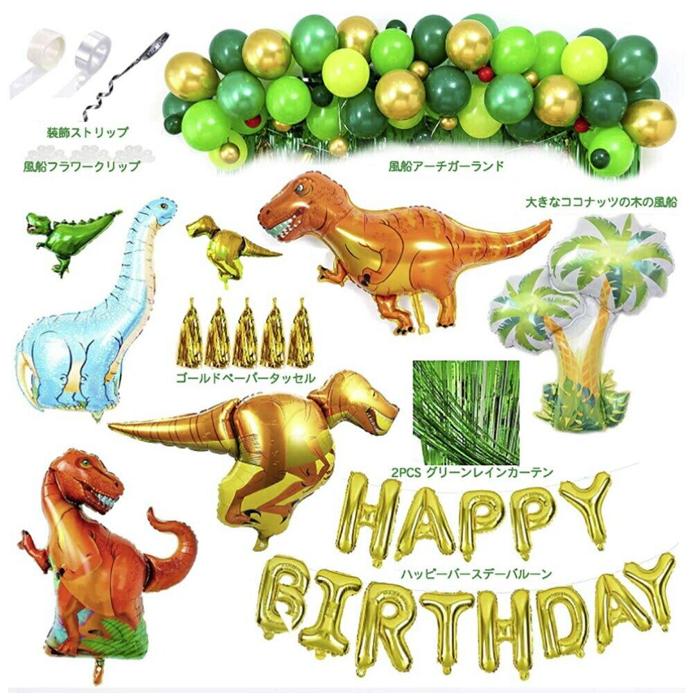 大きな恐竜(ティラノサウルス、ヴェロキラプトル、ブラキオサウルス、ティラノサウルス)×4、小さな恐竜×2ココナッツの木バルーン×1HAPPY BIRTHDAYバルーン×1バルーン(ゴールド、ダークグリーン、ライトグリーン、フルーツグリーン)×65バルーン(ゴールド、ダークグリーン、レッド)×1516インチアルミフィルムゴールデンバースデースーツ1セットグリーンパーティーレインカーテン2枚5つの金色のタッセル100グルードットの1パック3バルーンプラムクリップ、リボン1パックバルーンチェーン×1ディスペンサー×1巻大迫力!