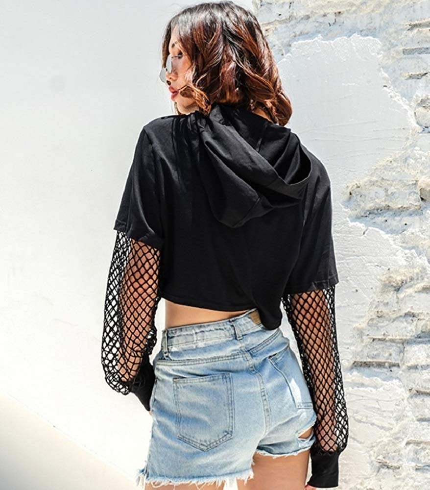 粗い目のメッシュ素材で仕上げた袖をレイヤードしているようなデザインのパーカー。