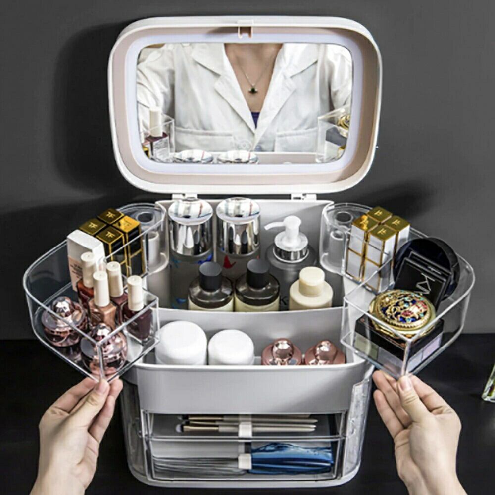 メイクボックス サイズ約30cm×約21cm×約31cm重量 約2300g素材 プラスチック*付属のゴム製の取っ手がありますのでサイドに装着すれば持ち運びができます*ピアスやネックレスを飾ることができる専用スペースが両サイドにあります*下部の2段になっている引き戸の取っ手は付属のゴム製の部品を折り曲げて穴に差し込んでお使いください*LEDライトの光量は3段階調節が可能です。