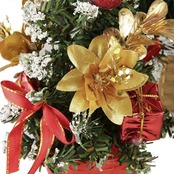 松ぼっくり、プレゼント、花装飾、ボール、リボンなど様々な装飾が飾ってあります。
