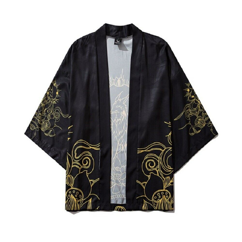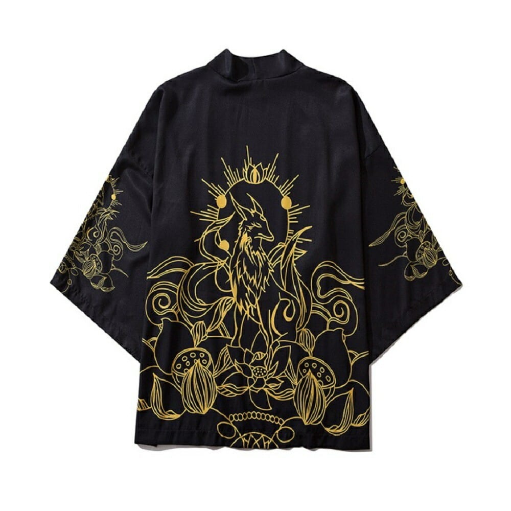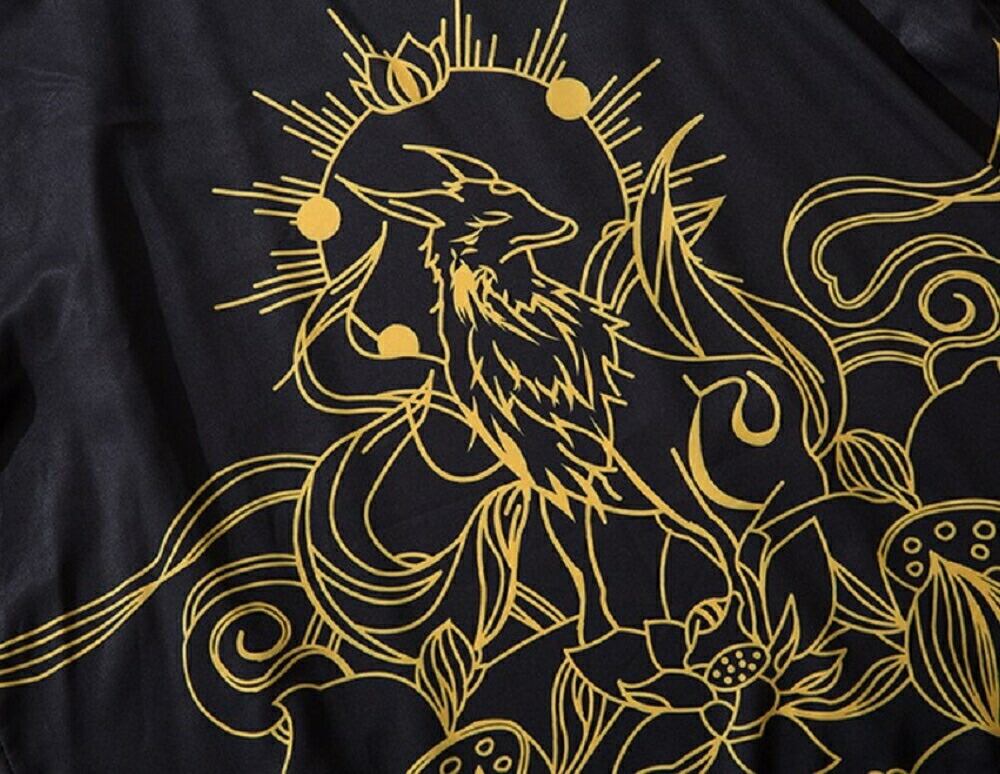 法被 後光 金狐 夏祭り 夏恋 寺 韓国ファッション 神社 羽織り 半纏 はんてん 法被 ハッピ サラサラの生地でできています古風和柄を入れることで粋を演出し、はっぴを着る楽しみ、遊びごころを大切にしています和のモチーフを使いながらも配色やパターンは和装らしからぬ大胆さで『法被であって、法被でない』新しい法被の形を展開女性でも男性でも使用可能なフリーサイズ!