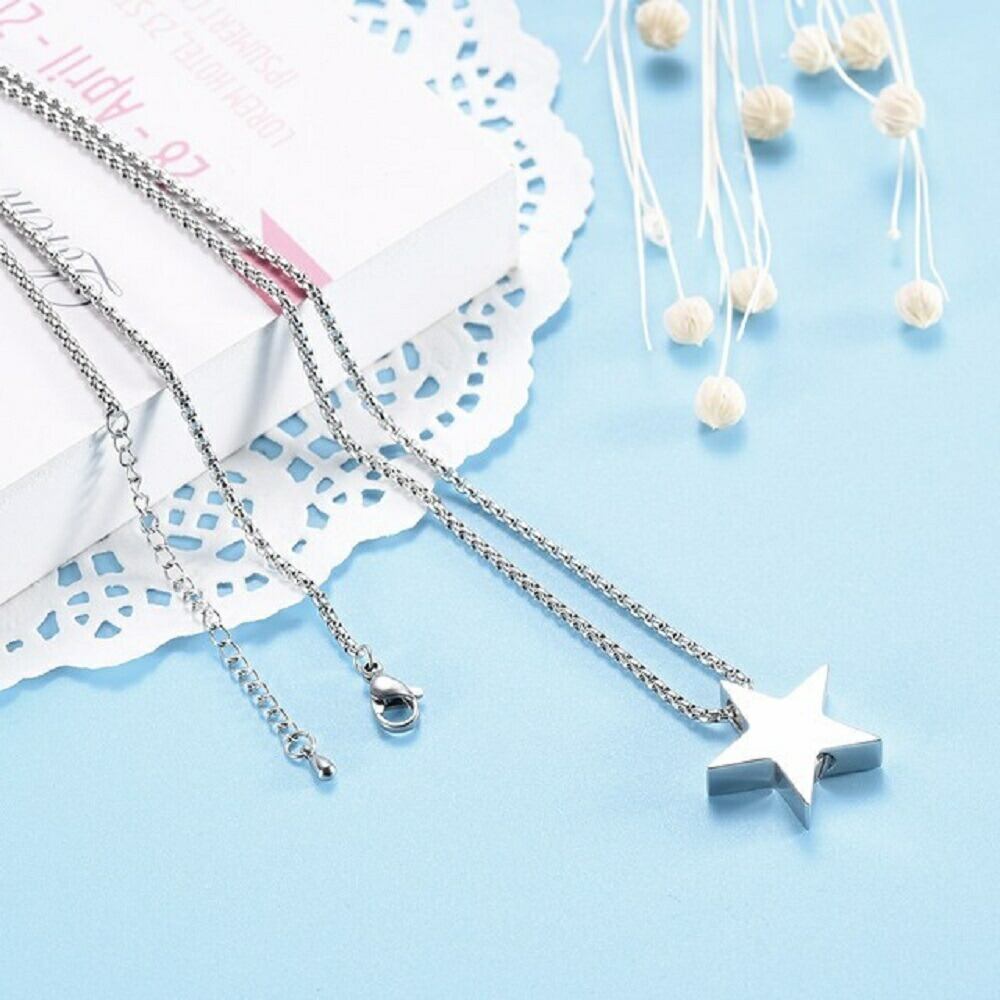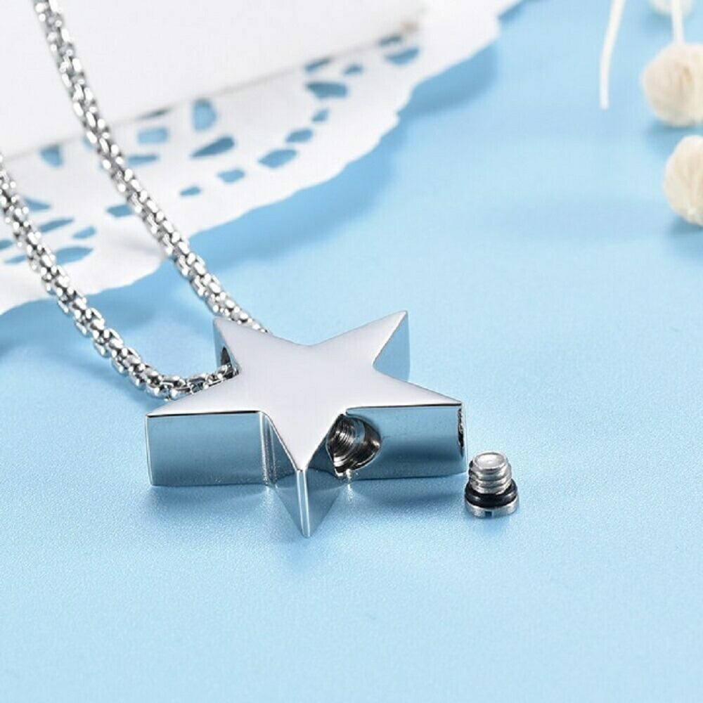 スター 星型 ペンダントチェーン付き アクセサリー サイズトップ:縦約2.2紐付き調整可能タイプ:調整可能範囲 約50cm?55cm※こちらはネックレス紐タイプ調整可能タイプとトップのセットとなります素材:ステンレス最愛なる方、愛犬愛猫などの遺骨や遺品を納める事が出来るネックレスです。