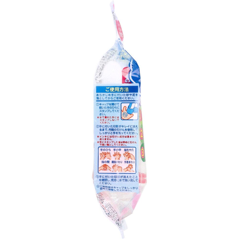 ・あらかじめ手に付いた砂や泥を落としてからご使用ください。(1)キャップを開けて乾いた手のひらにスタンプしてください。※水で濡れた手にはスタンプしないでください。(2)手に付いた印影がキレイに消えるまで、市販の石けんを使用してしっかりと手を洗ってください。※インキには石けん成分は含まれておりません。※手にスタンプした後は早めに石けんで洗い落としてください。(3)手に付いた印影が消えたことを確認し、充分に水で洗い流してください。(4)ご使用後はキャップをしっかり閉めて保管してください。