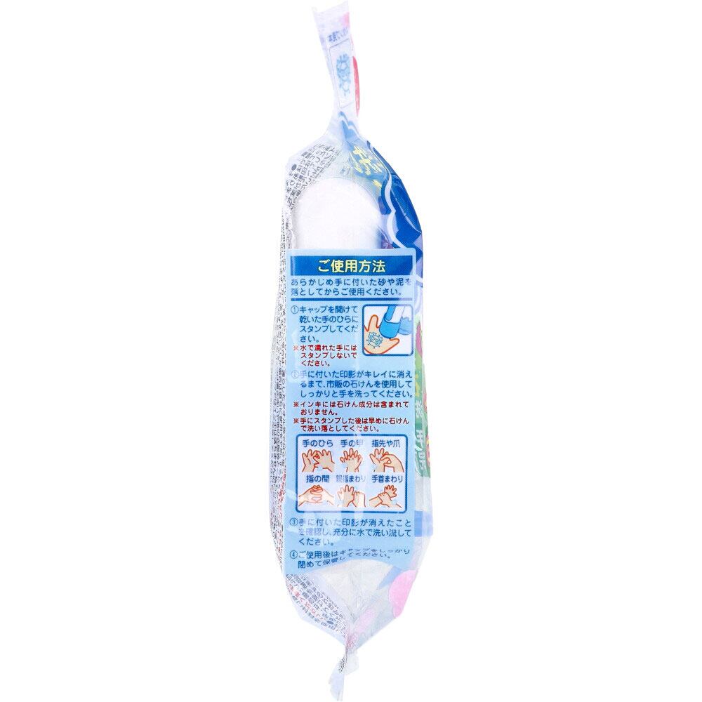 ・あらかじめ手に付いた砂や泥を落としてからご使用ください。(1)キャップを開けて乾いた手のひらにスタンプしてください。※水で濡れた手にはスタンプしないでください。(2)手に付いた印影がキレイに消えるまで、市販の石けんを使用してしっかりと手を洗ってください。※インキには石けん成分は含まれておりません。※手にスタンプした後は早めに石けんで洗い落としてください。(3)手に付いた印影が消えたことを確認し、充分に水で洗い流してください。(4)ご使用後はキャップをしっかり閉めて保管してください。