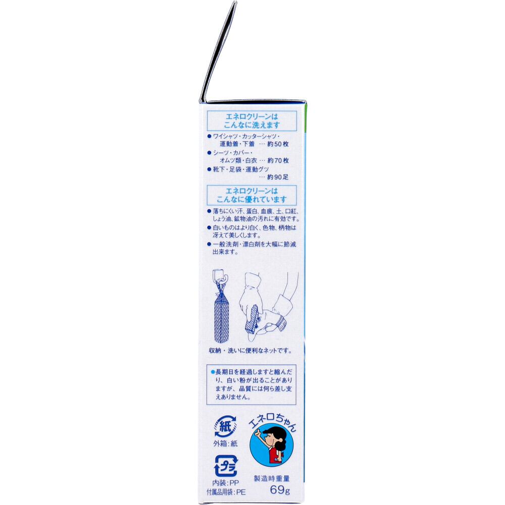 ●エネロクリーンはこんなに優れています。・落ちにくい汗、蛋白、血痕、土、口紅、しょう油、鉱物油の汚れに有効です。・白いものはより白く、色物、柄物は冴えて美しくします。・一般洗剤・漂白剤を大幅に節減出来ます。