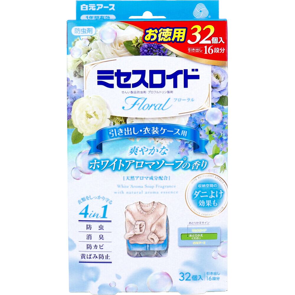 ミセスロイド フローラル 防虫剤 引き出し・衣装ケース用 1年間有効 ホワイトアロマソープの香り 32個入【pto】