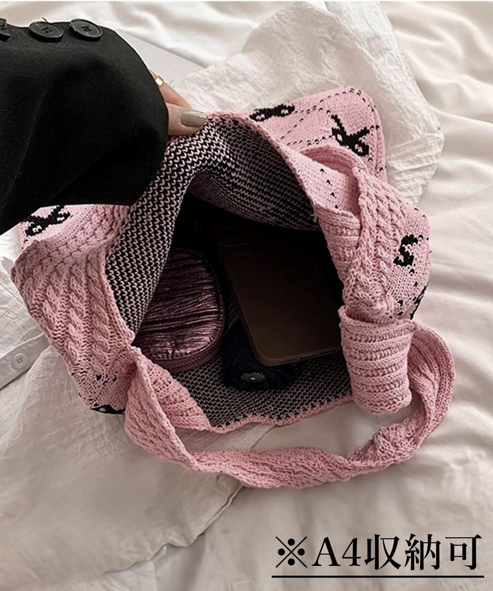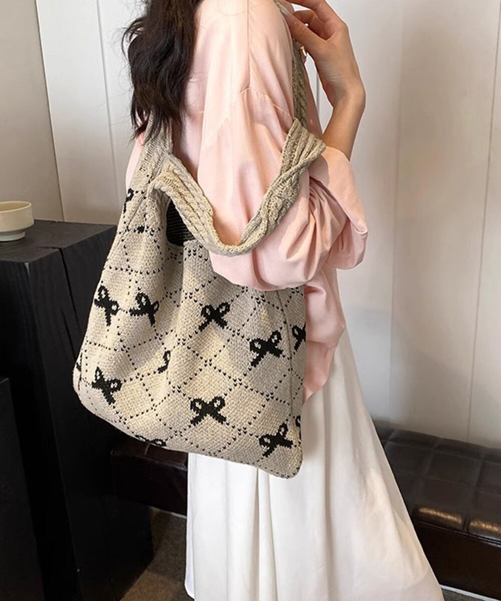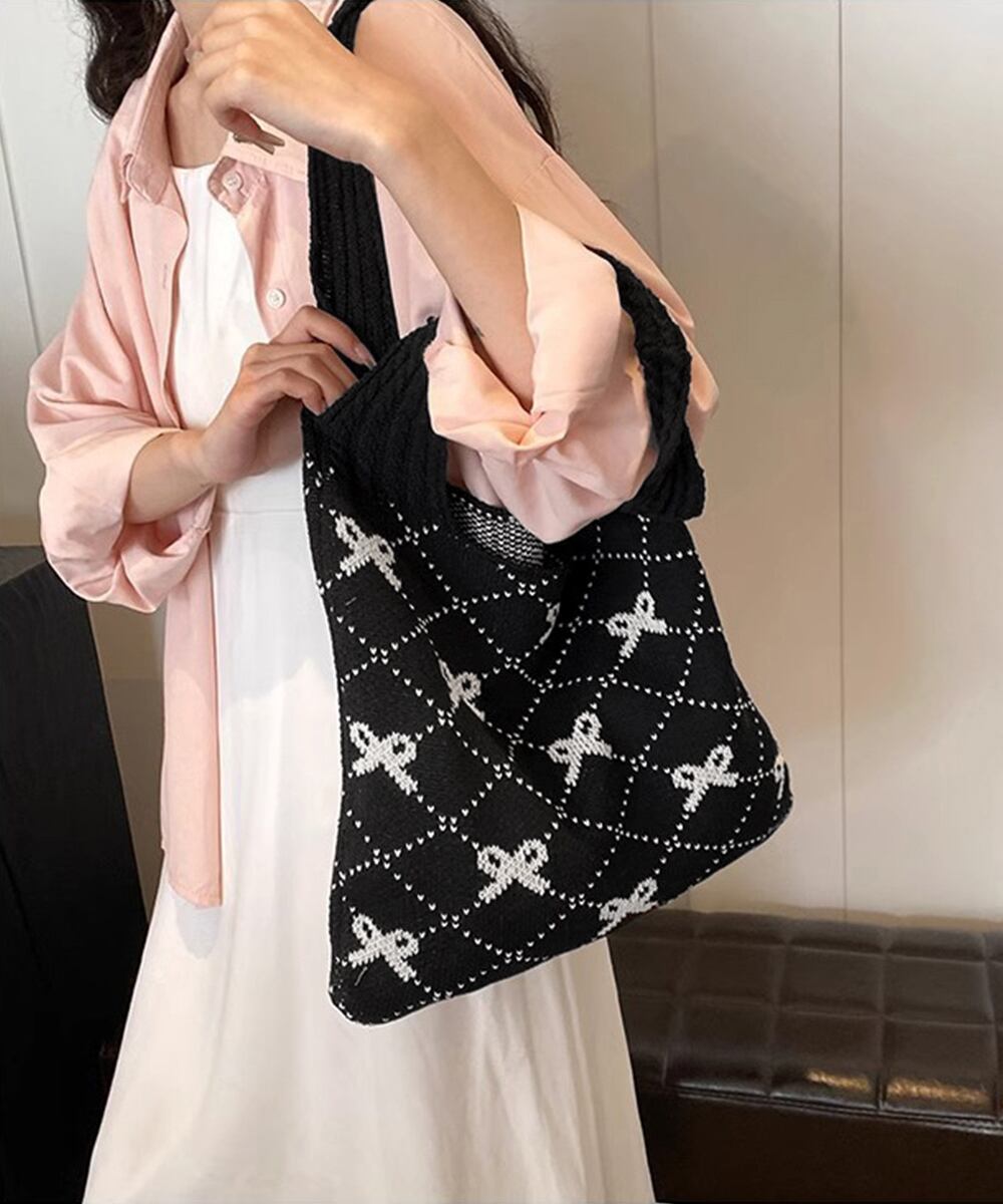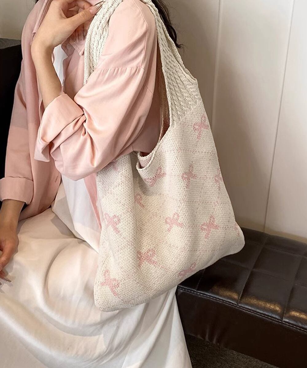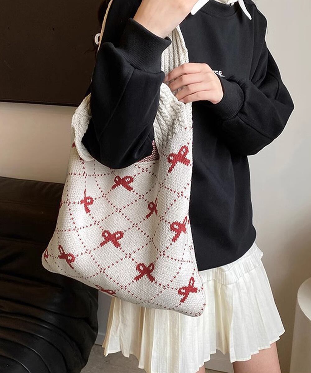可愛いリボン柄がアクセントになり、コーデにこなれ感をプラスするニットトートバッグ