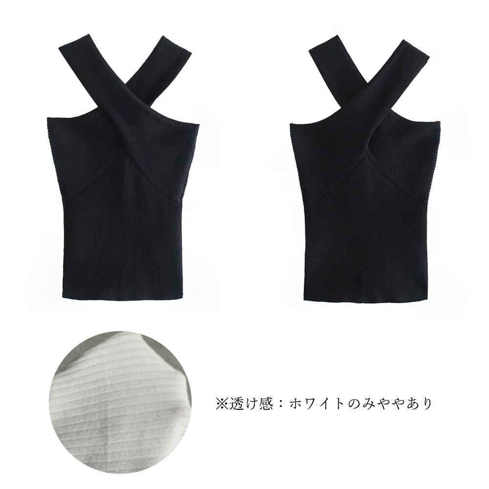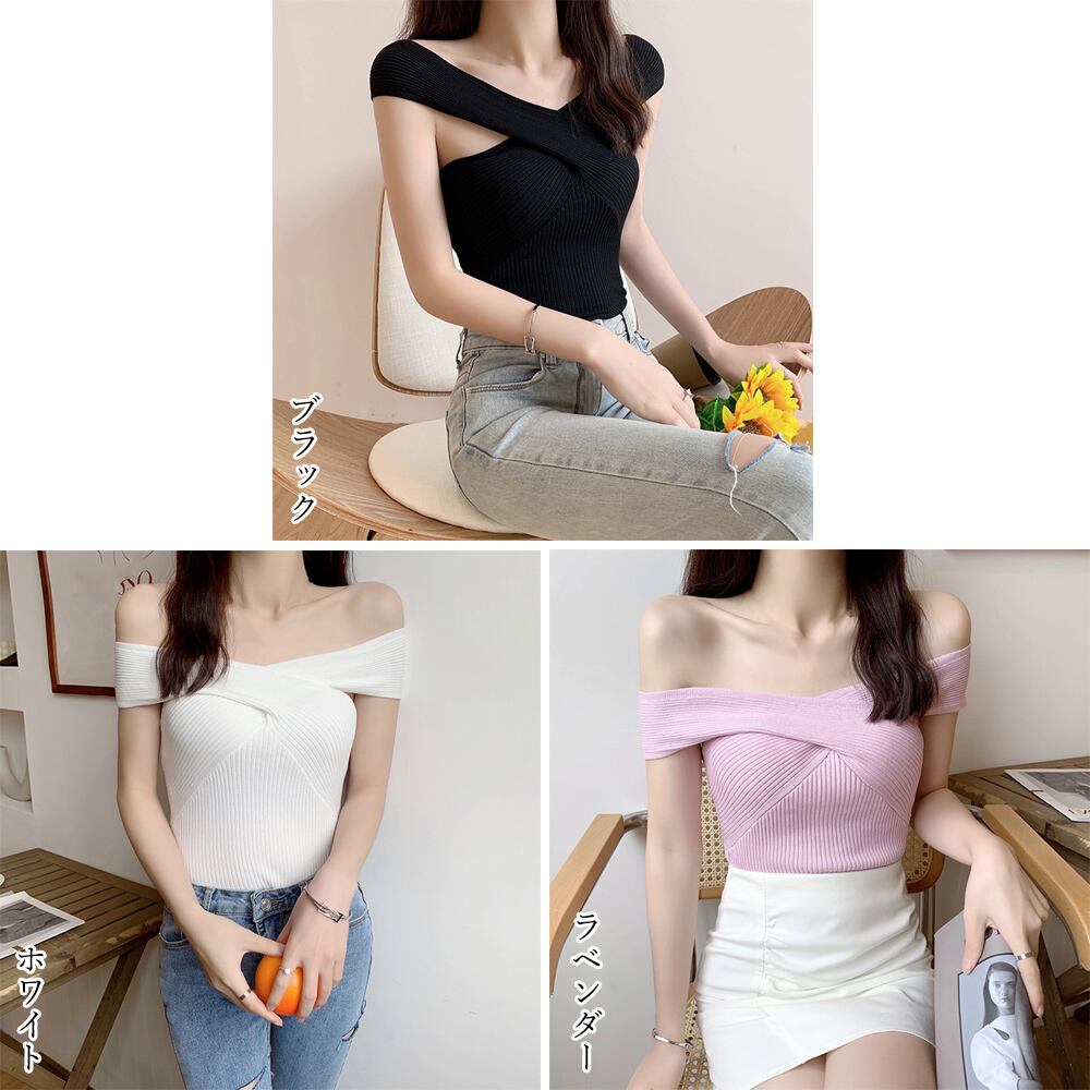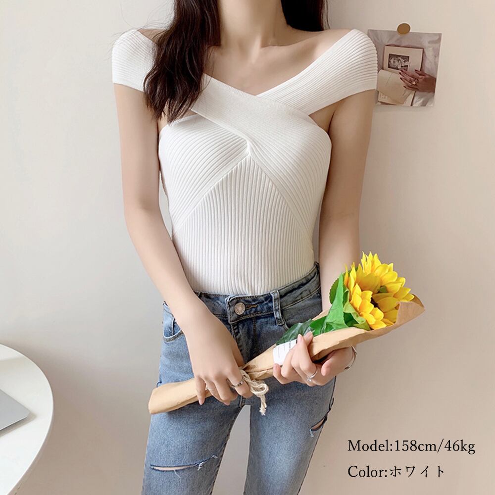 ニットトップス レディース クロスデザイン セクシーリブニット Vネック 無地 肩だしニット フィット感 ニットインナー