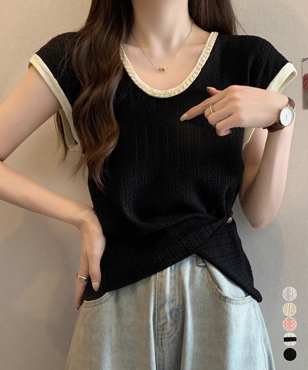 ノースリーブニットトップス きれいめ 配色 春夏トップス 丸首 薄手ニットソー韓国風 カジュアル