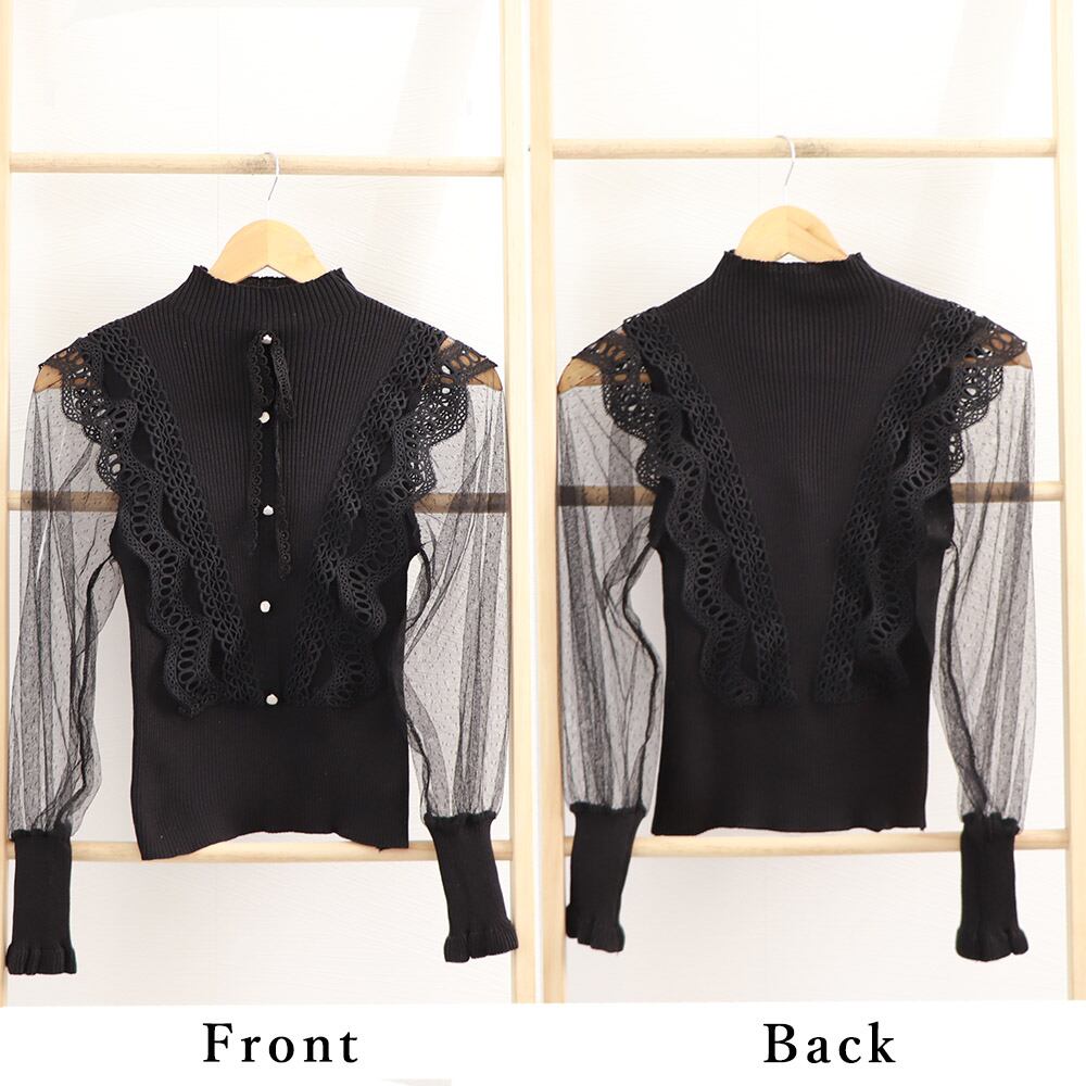 シアー素材のキャンディスリーブが女性らしさを際立たせる切り替えニットトップス