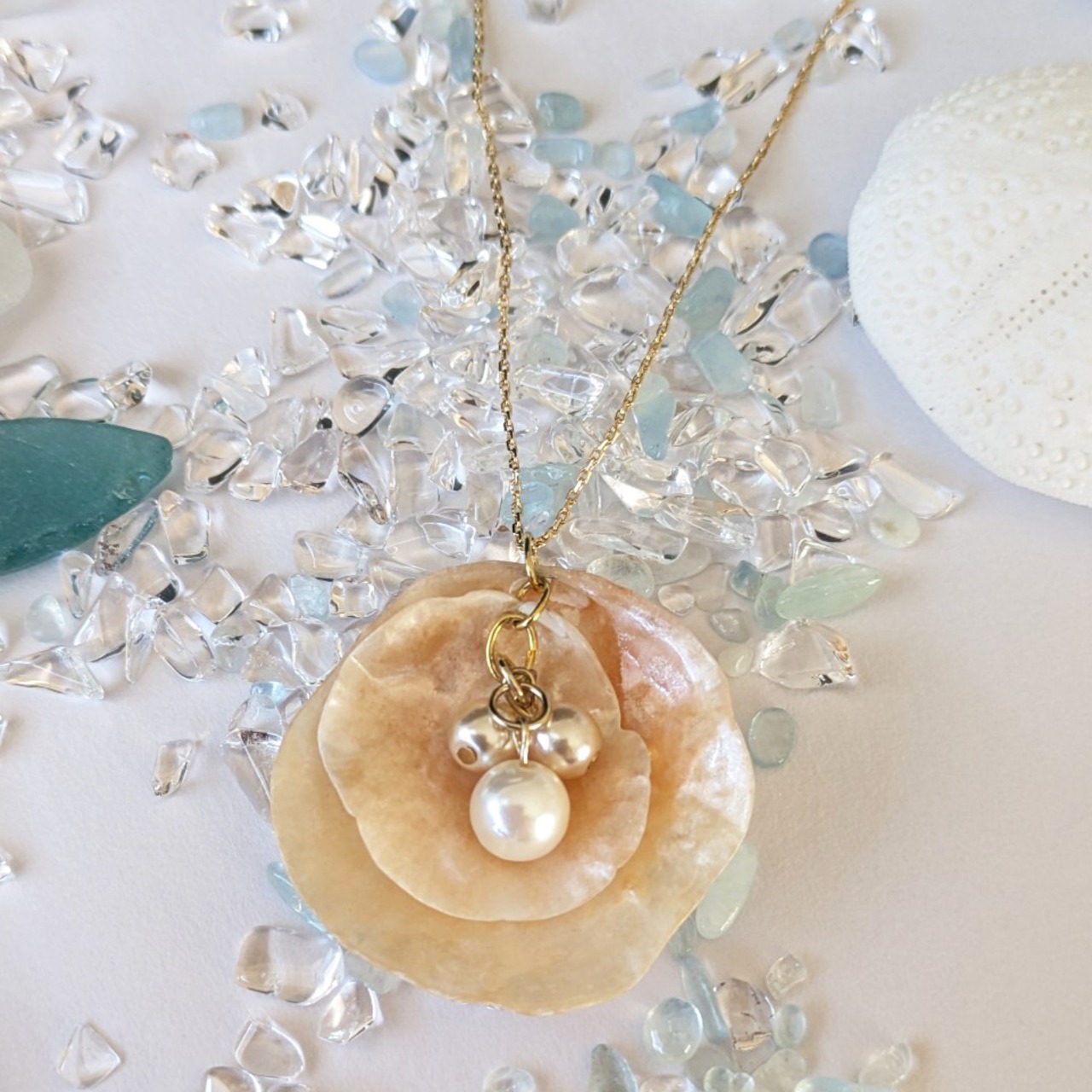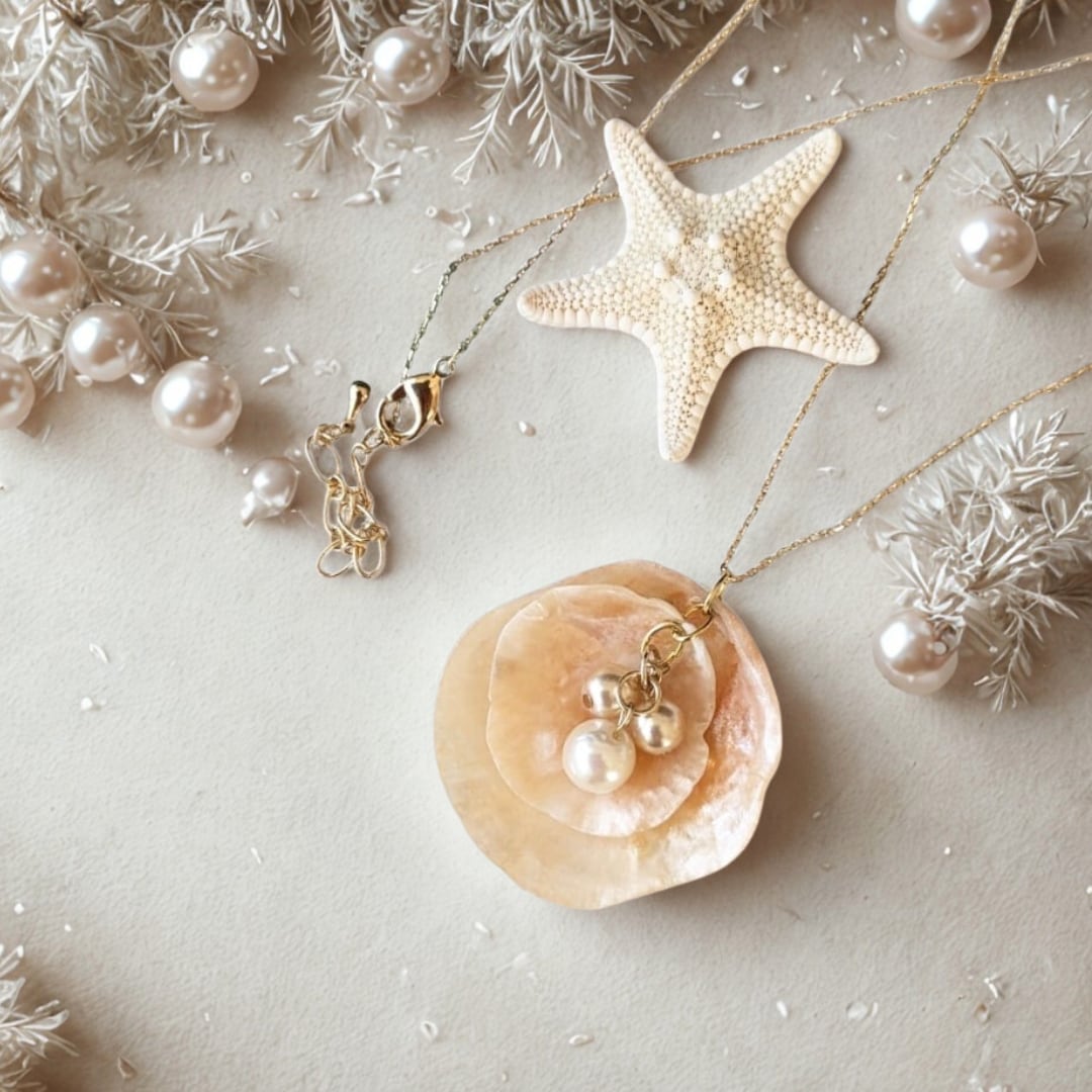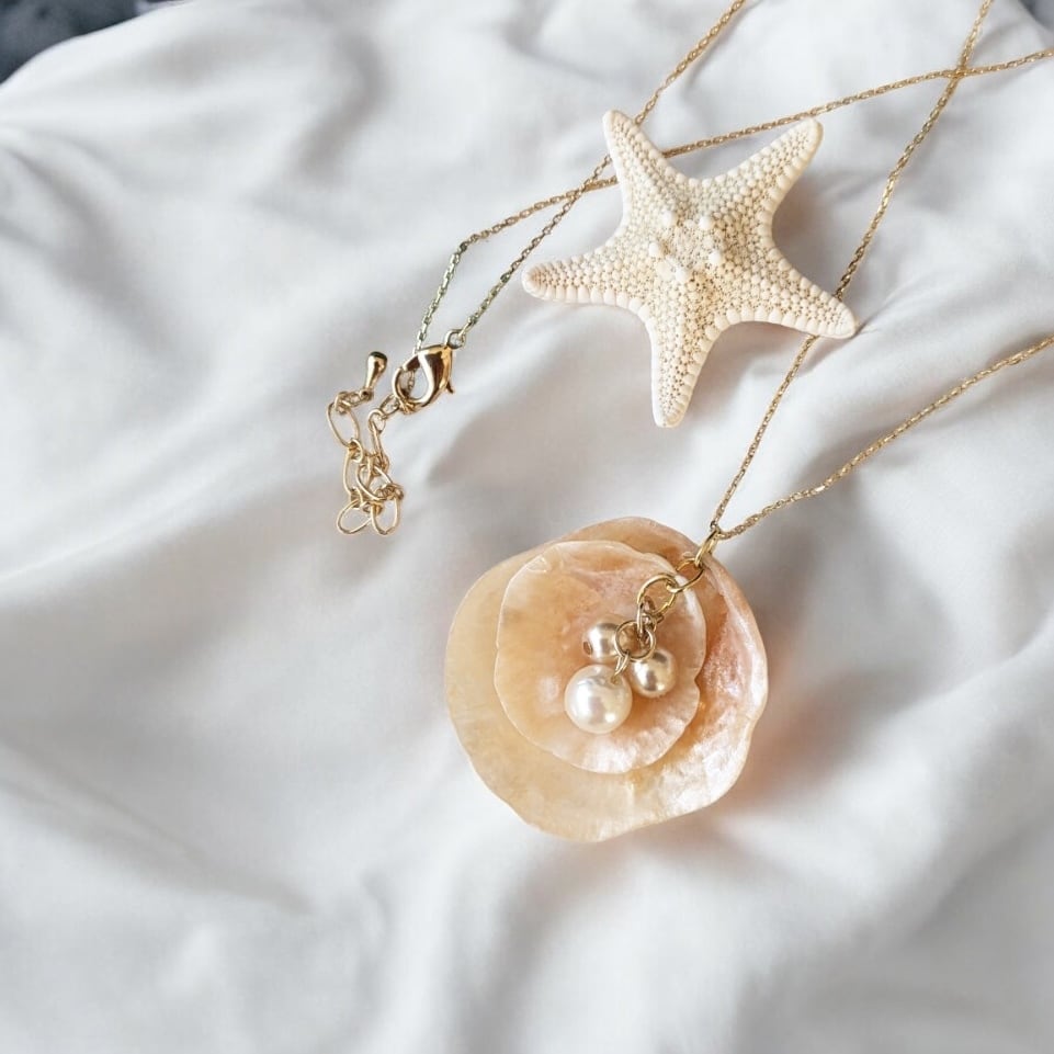淡いオレンジの貝殻と揺れるパールが首元に繊細な華やかさを添えます。
