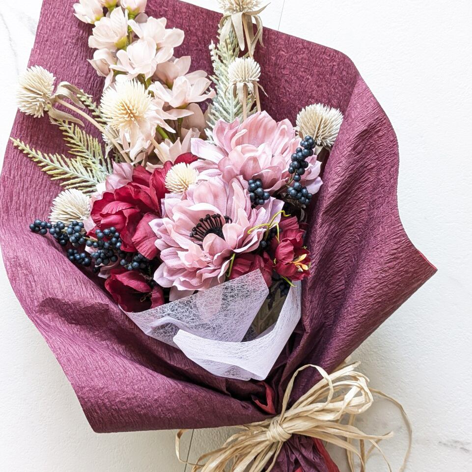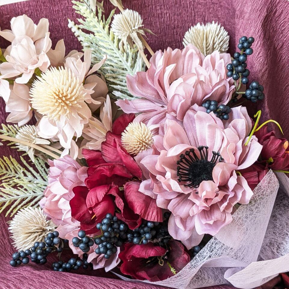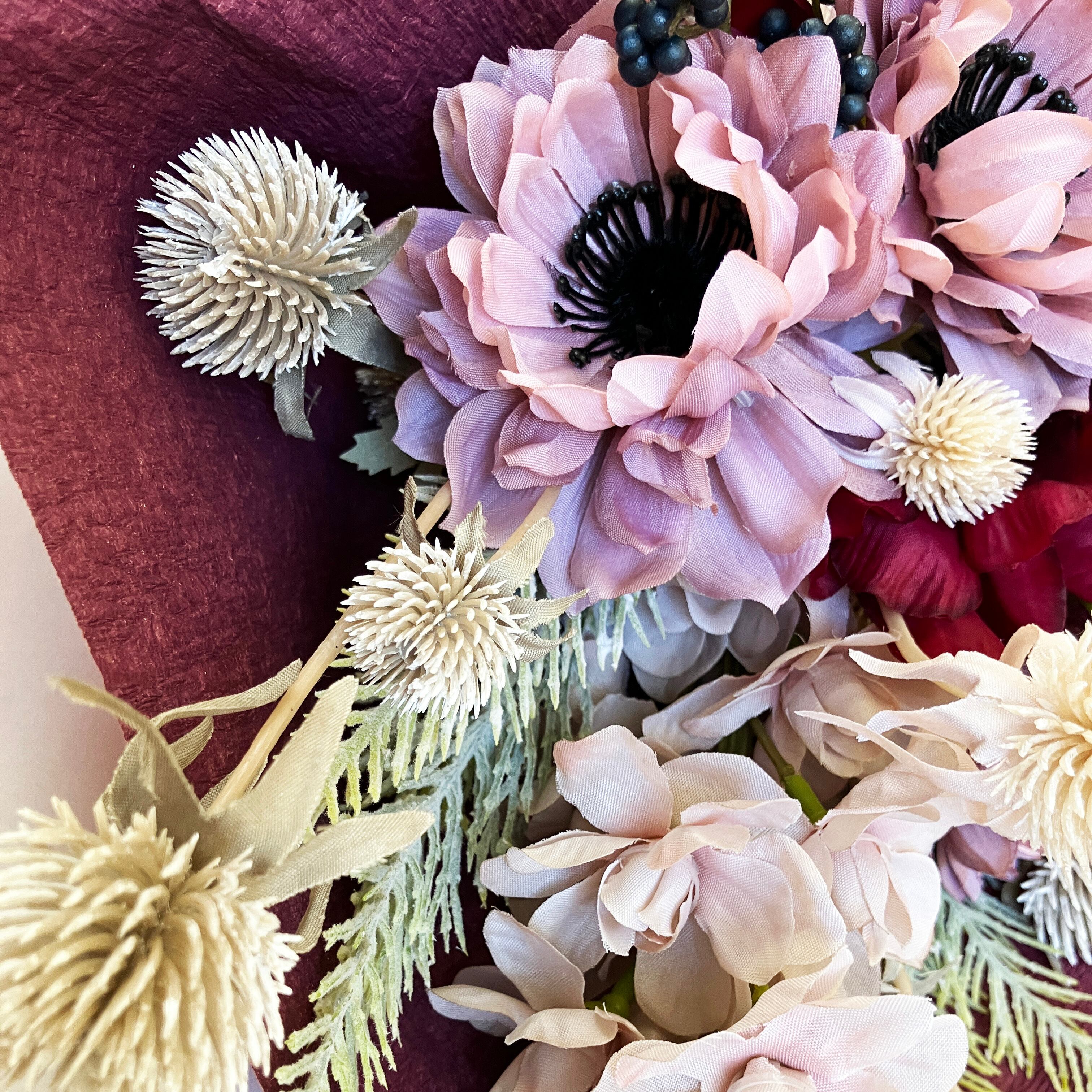 レッドの深みとスモーキーピンクの柔らかさが織りなす、上品でシックなリース。