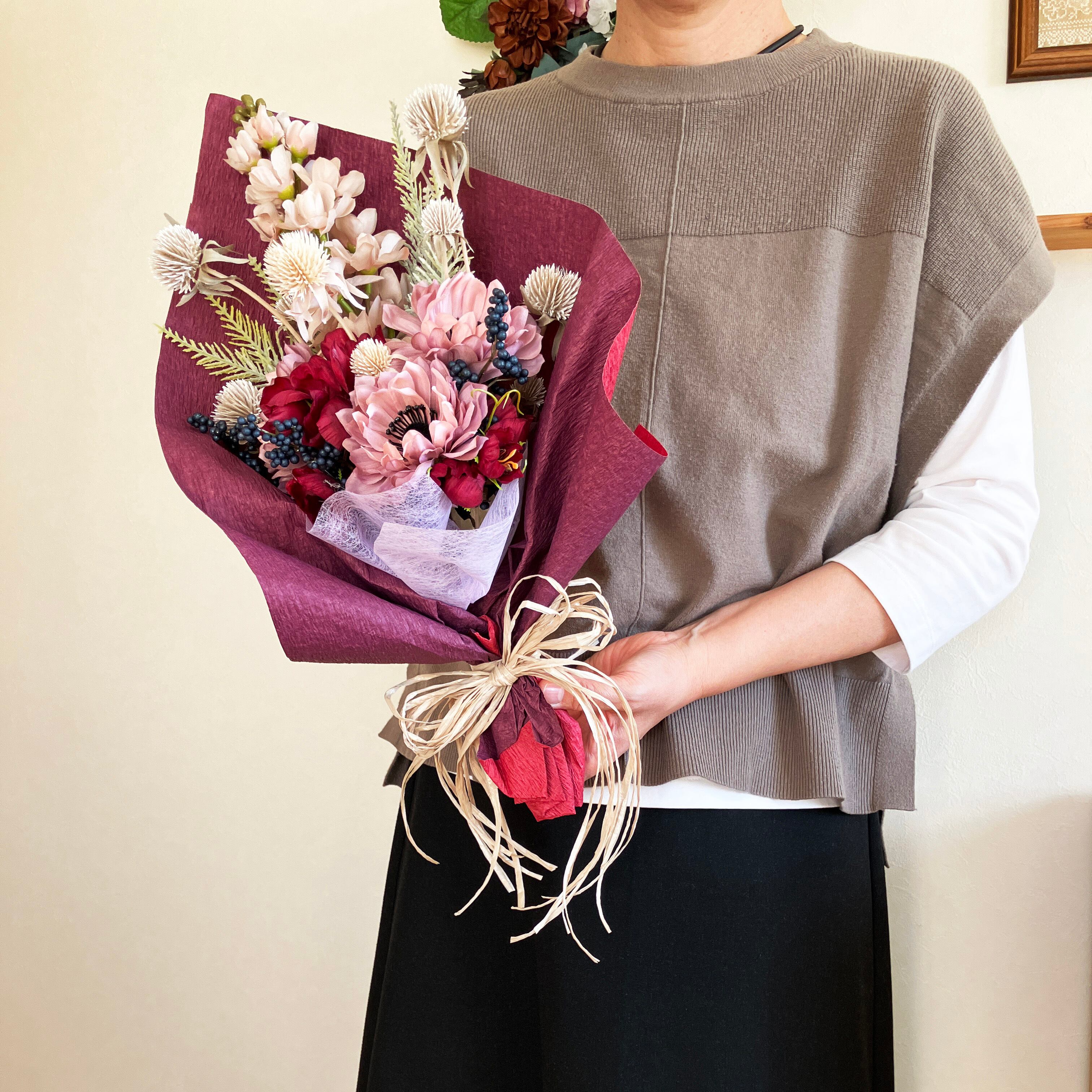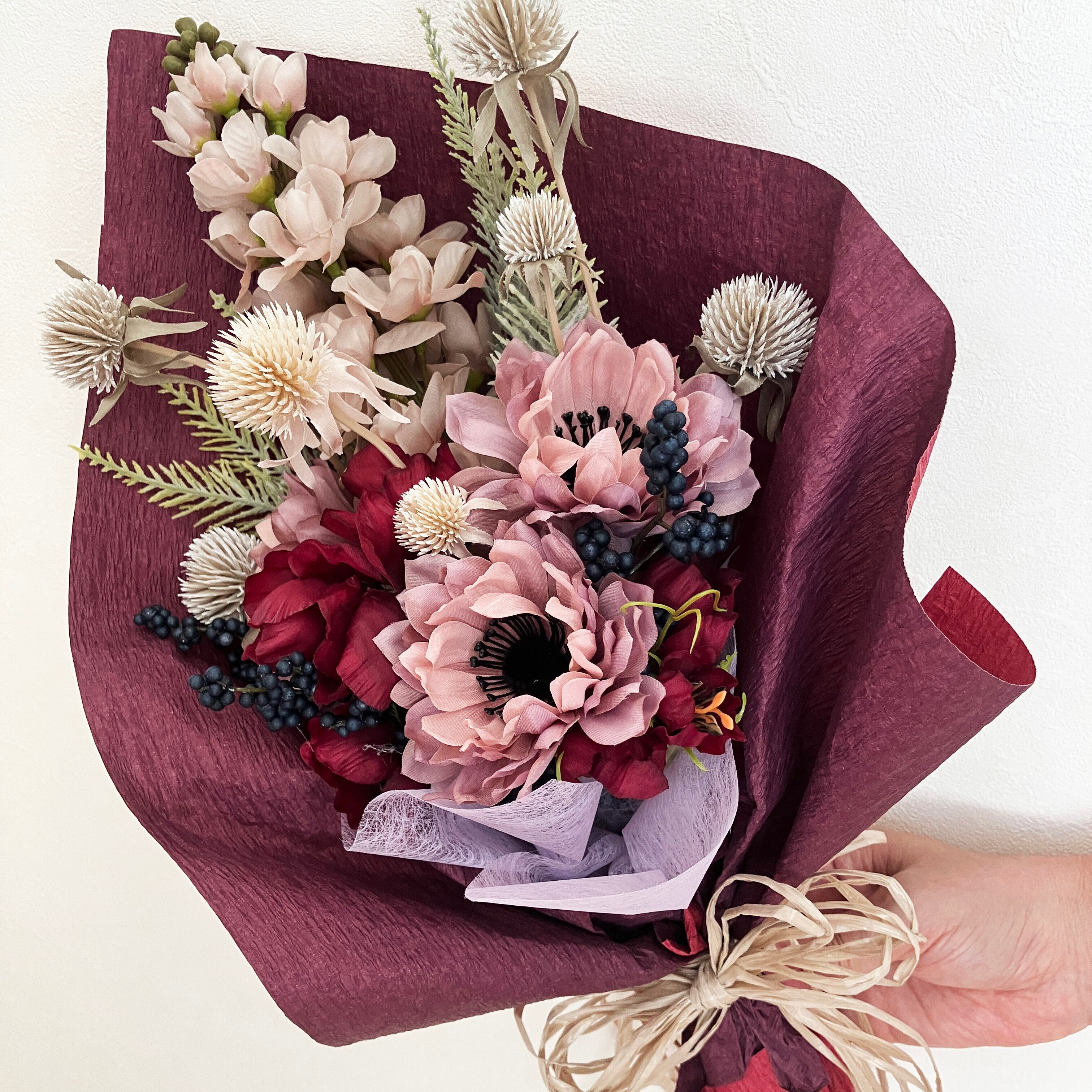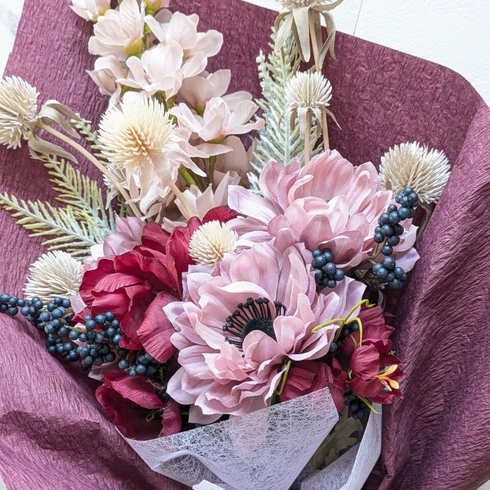 レッドの深みとスモーキーピンクの柔らかさが織りなす、上品でシックなリース。
