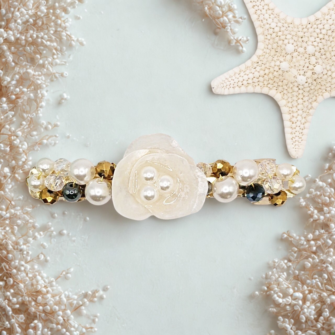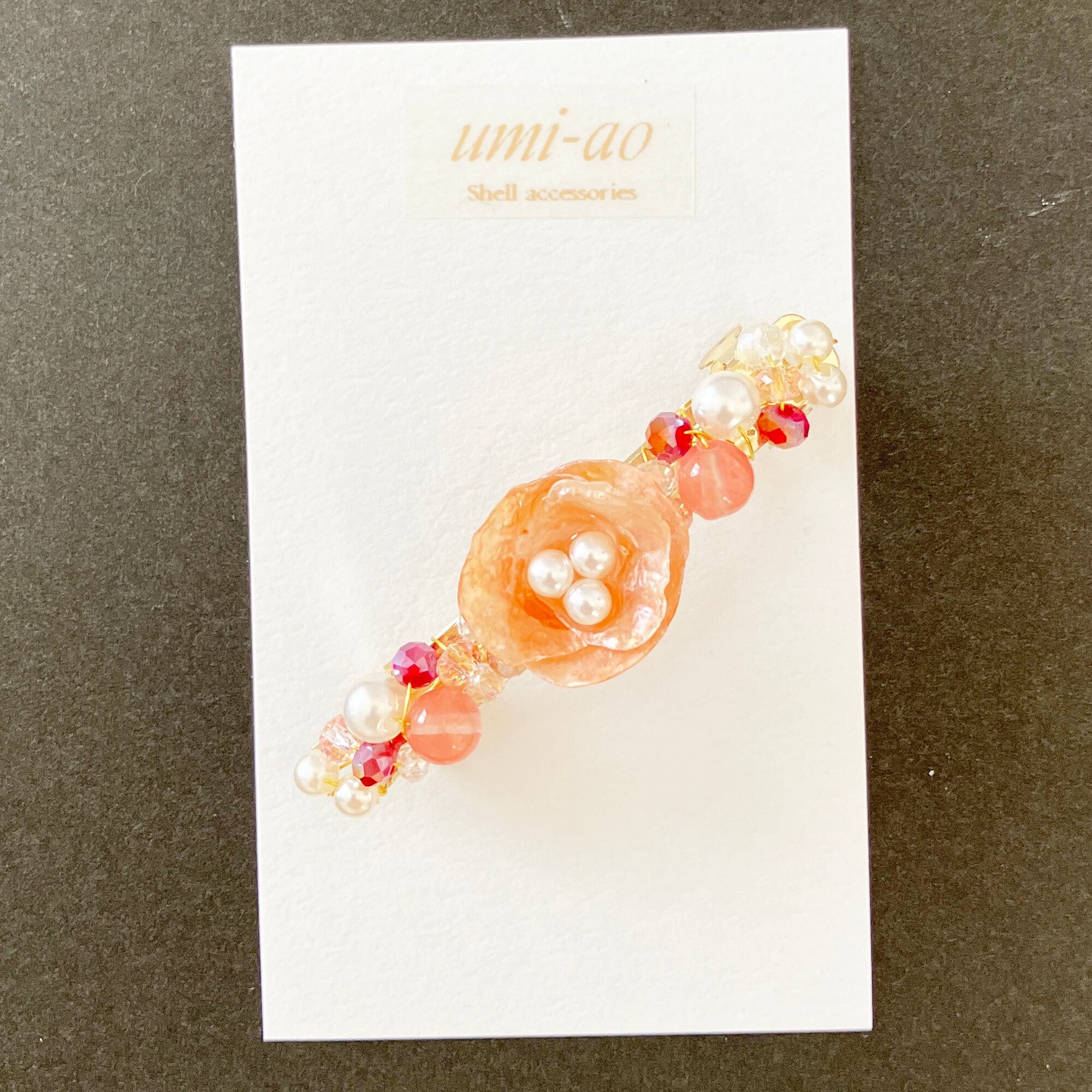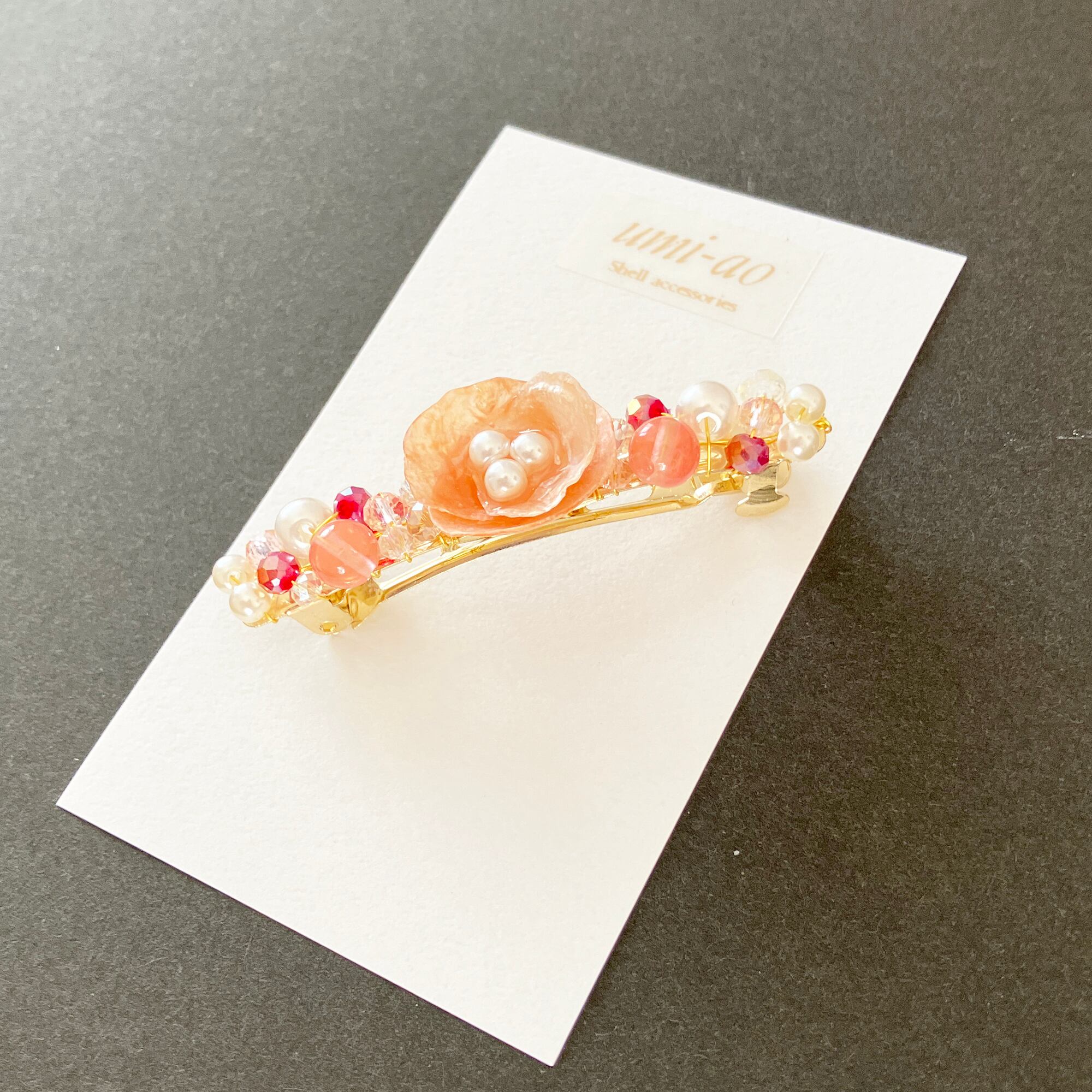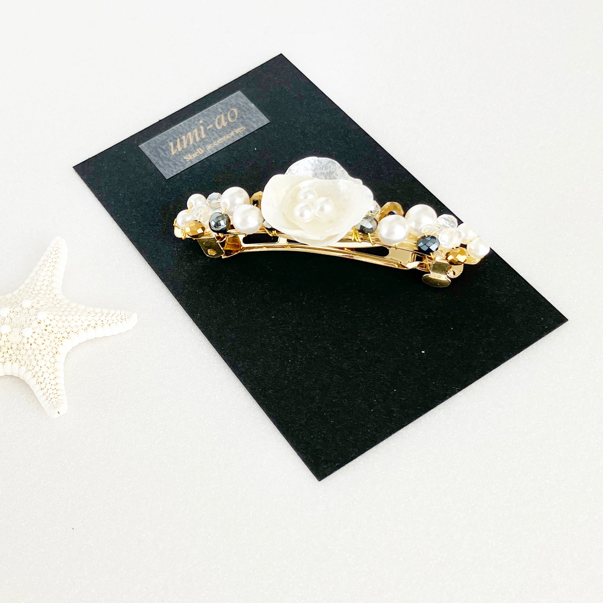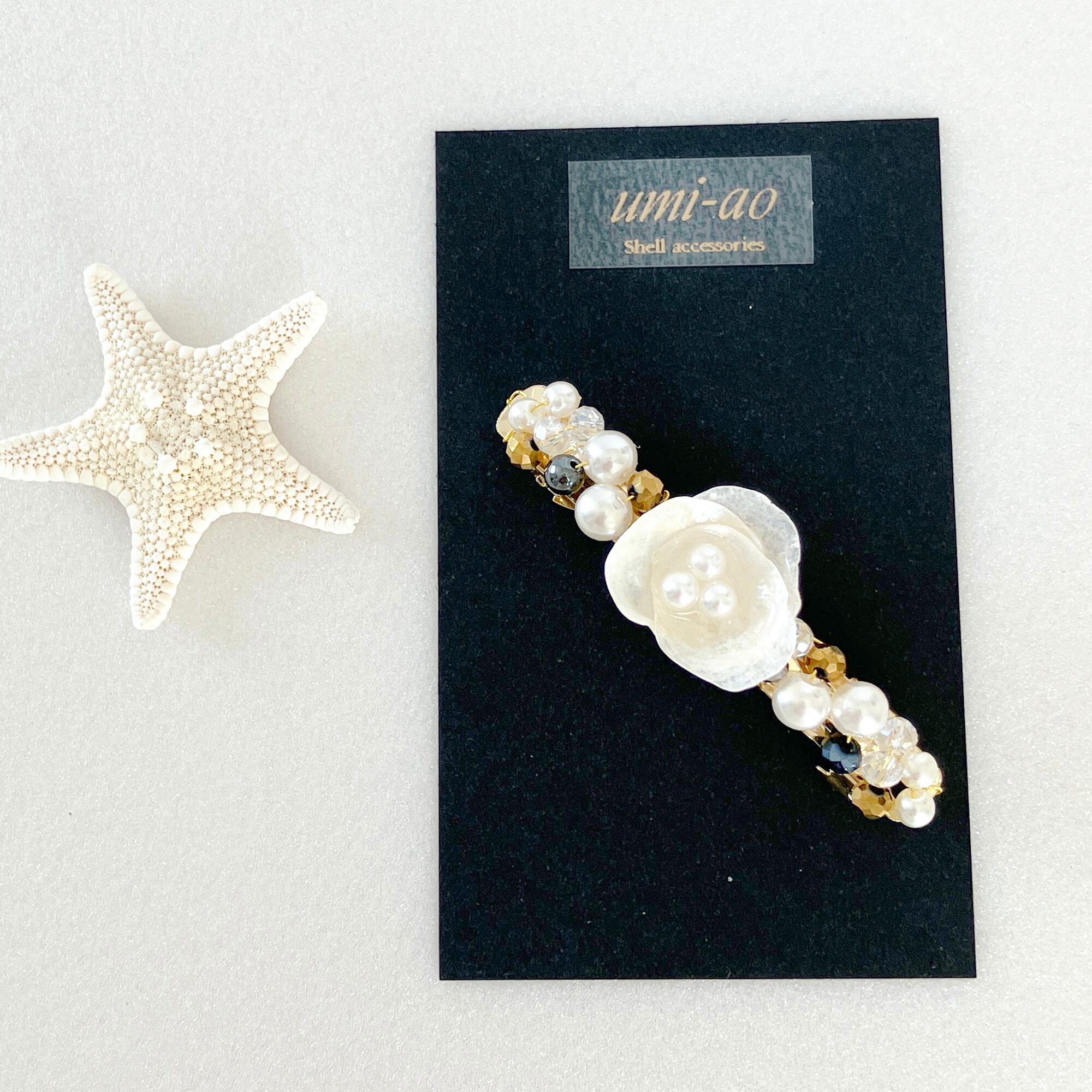 幸せを運ぶナミマガシワの貝殻を小花のように仕上げた可憐なバレッタ。