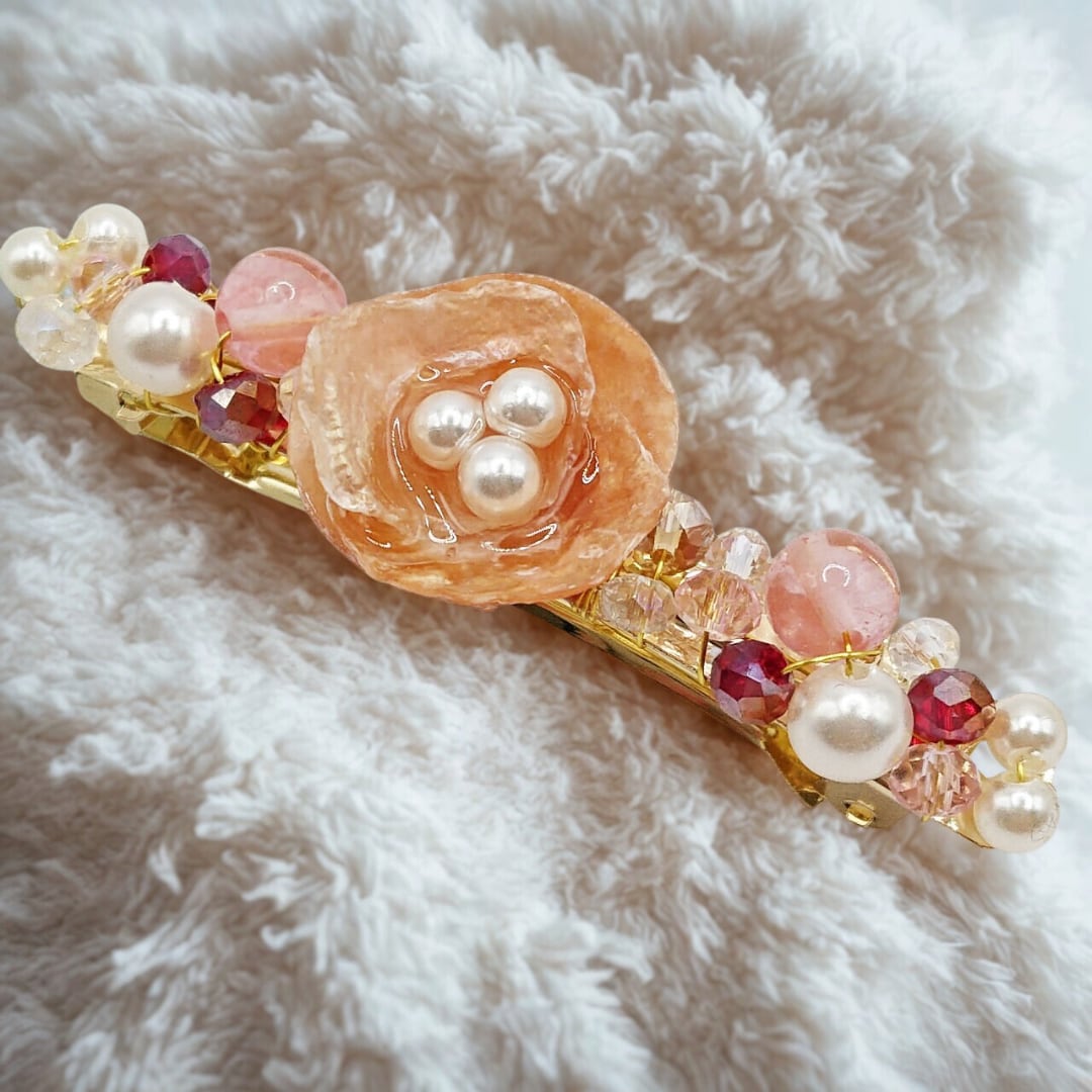 中央の淡いピンクと繊細なビーズが、上品で優しい雰囲気を演出します。