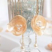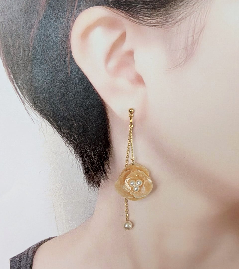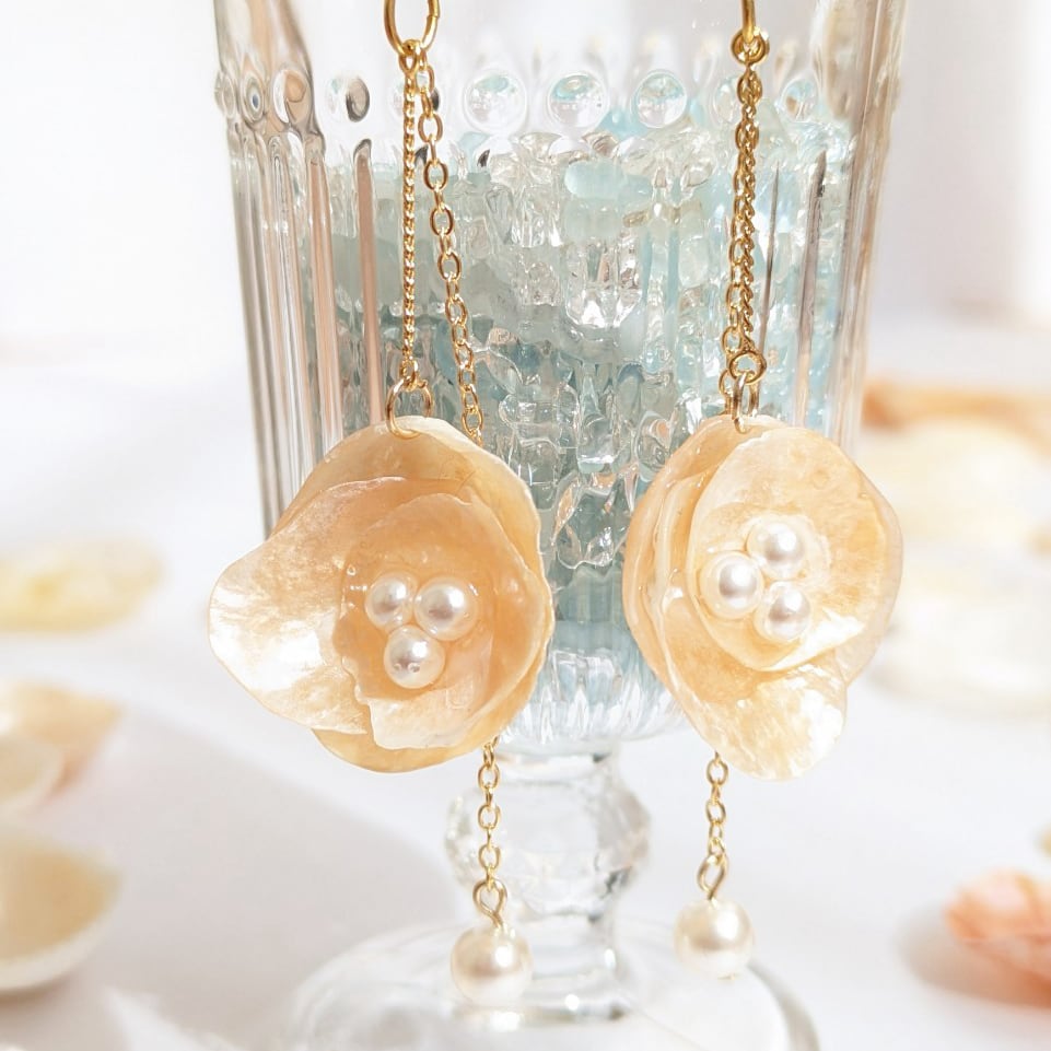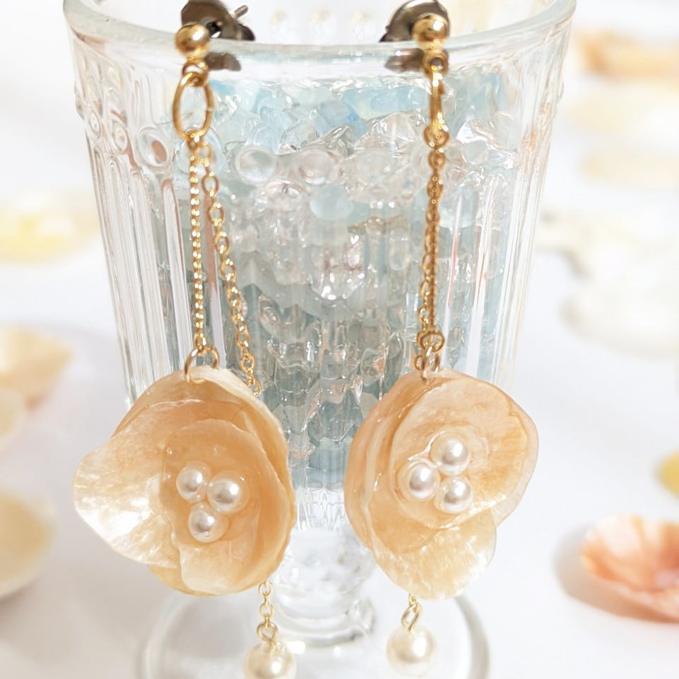 天然のナミマガシワにパールビーズをあしらった、揺れるエレガントなロングチェーンピアス。