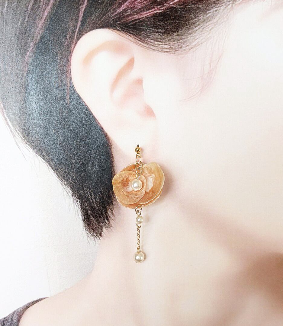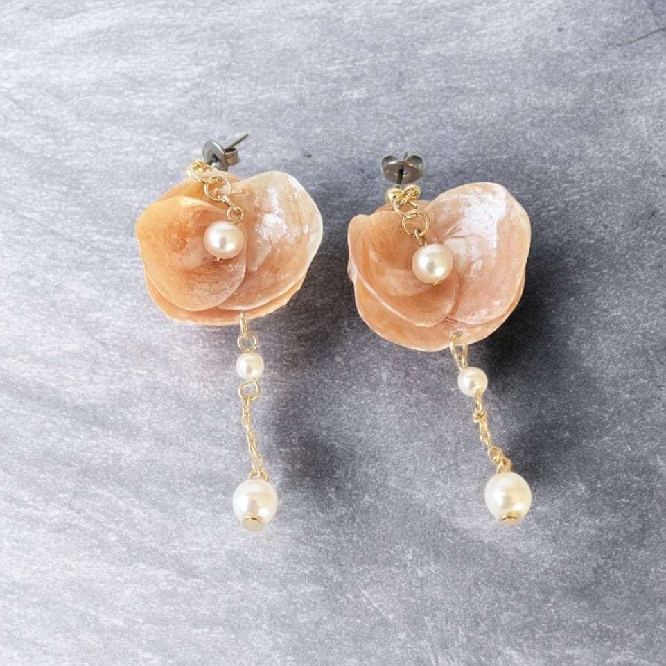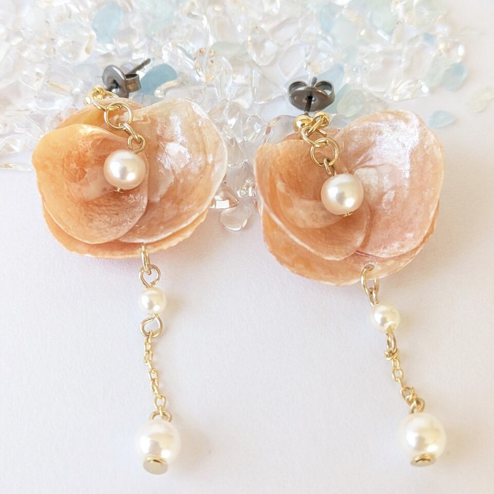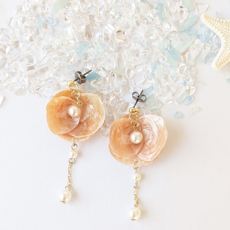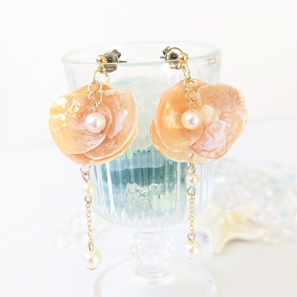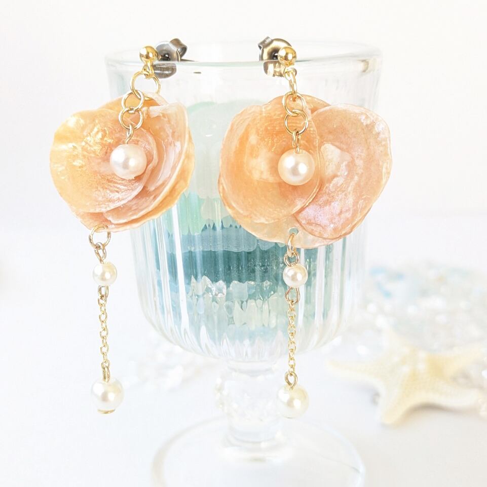 春風に揺れるシェルピアス 〜花びらとパールのナチュラルな輝き〜