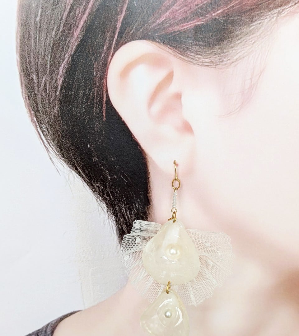レースを施した2連フックピアスは、花びらのように繊細に揺れ、特別な日の装いを美しく引き立てます。