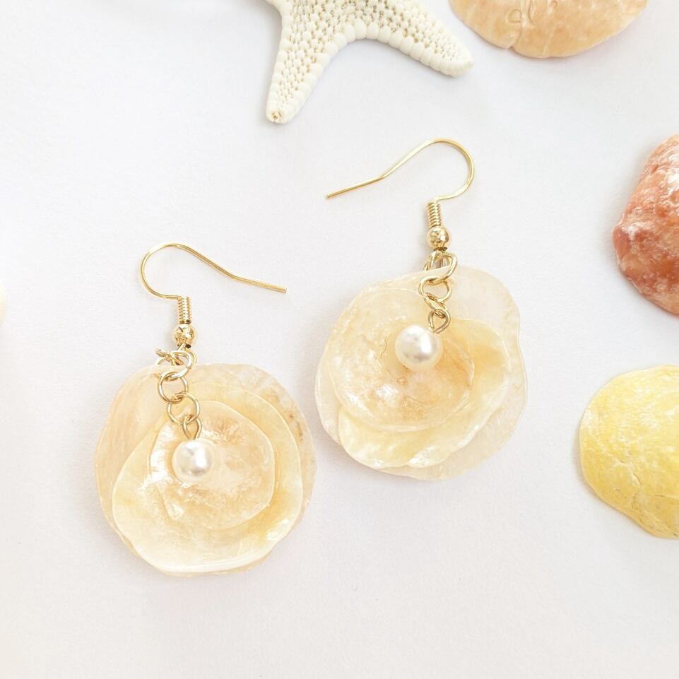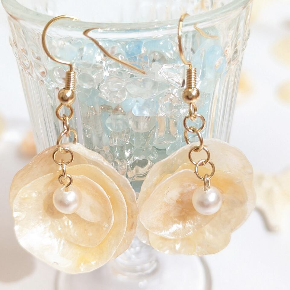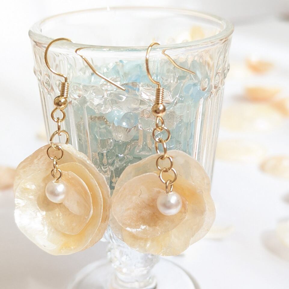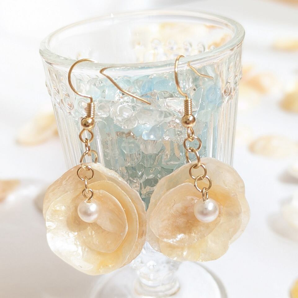 花びらのように重なり合うシェルが繊細で可憐な印象を演出し、耳元でそっと揺れながら優しい輝きを放ちます。