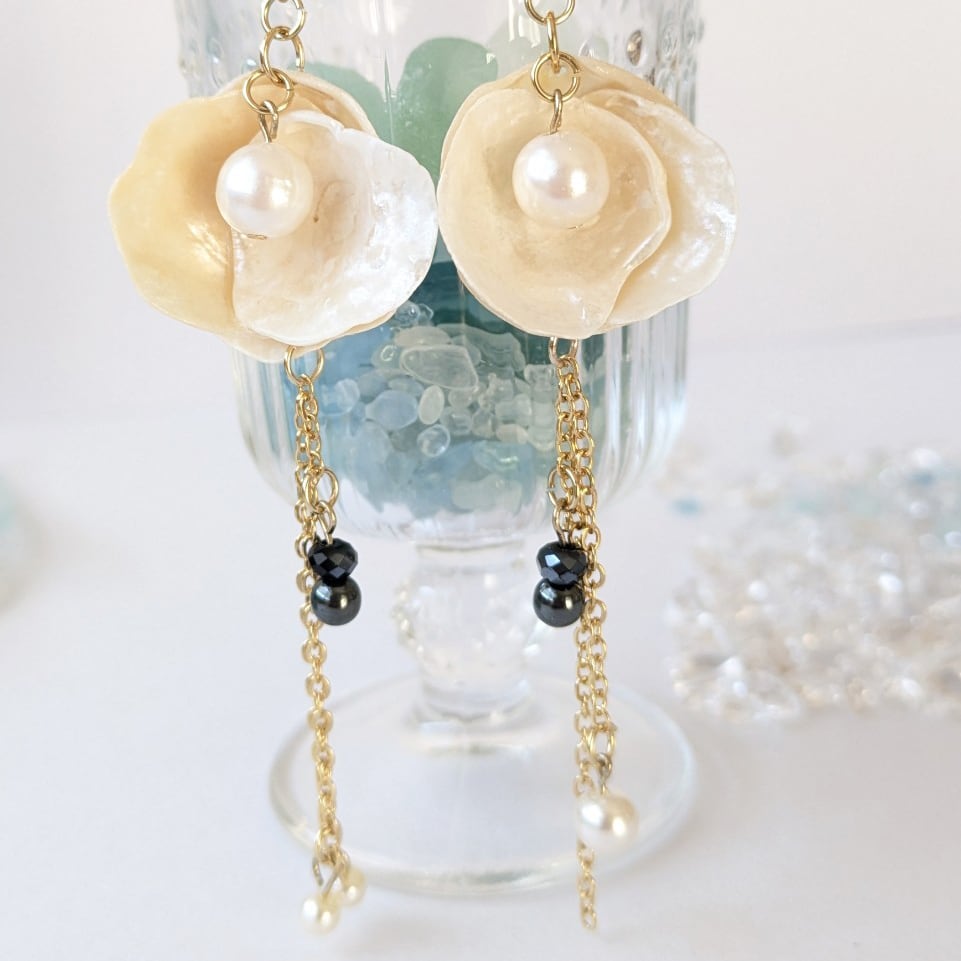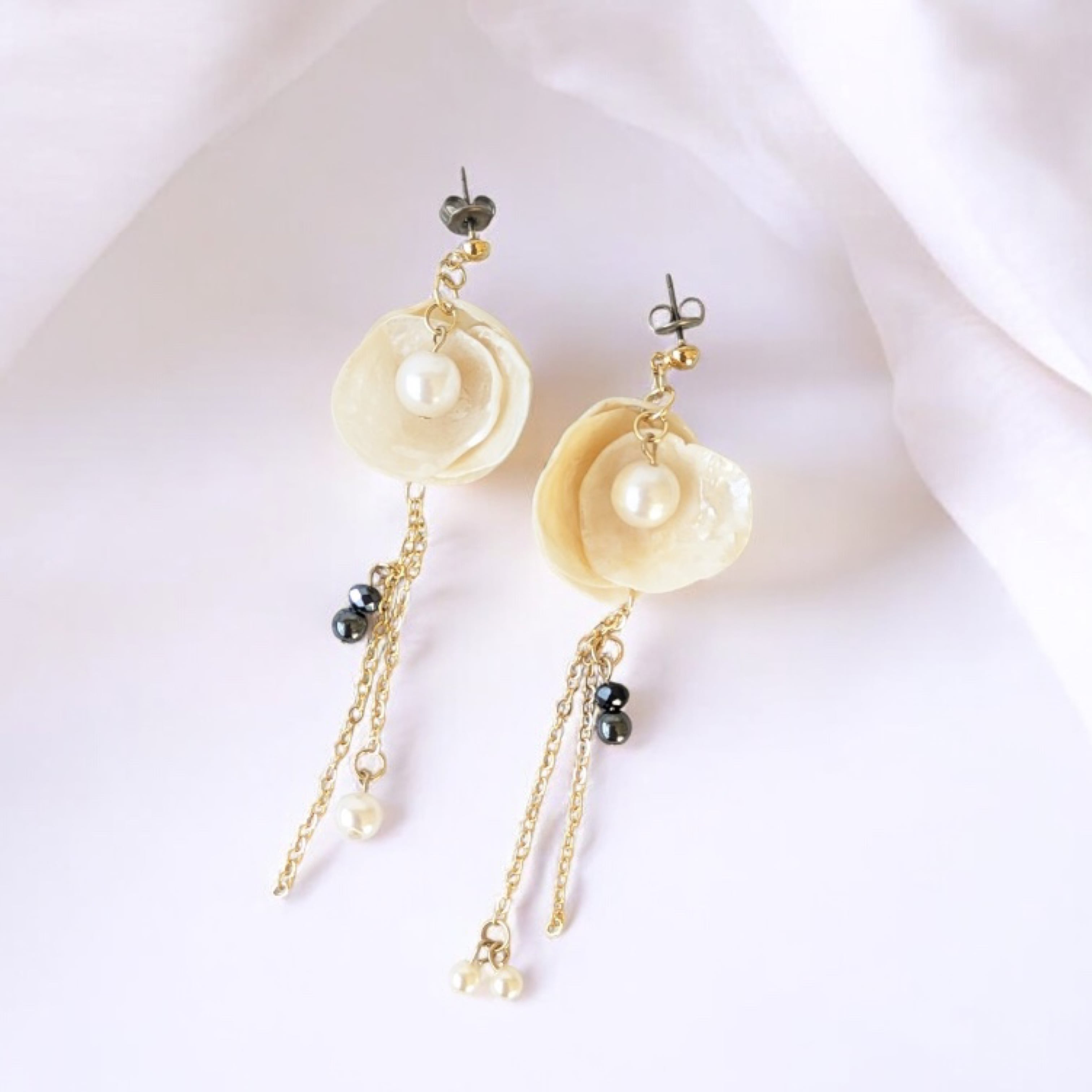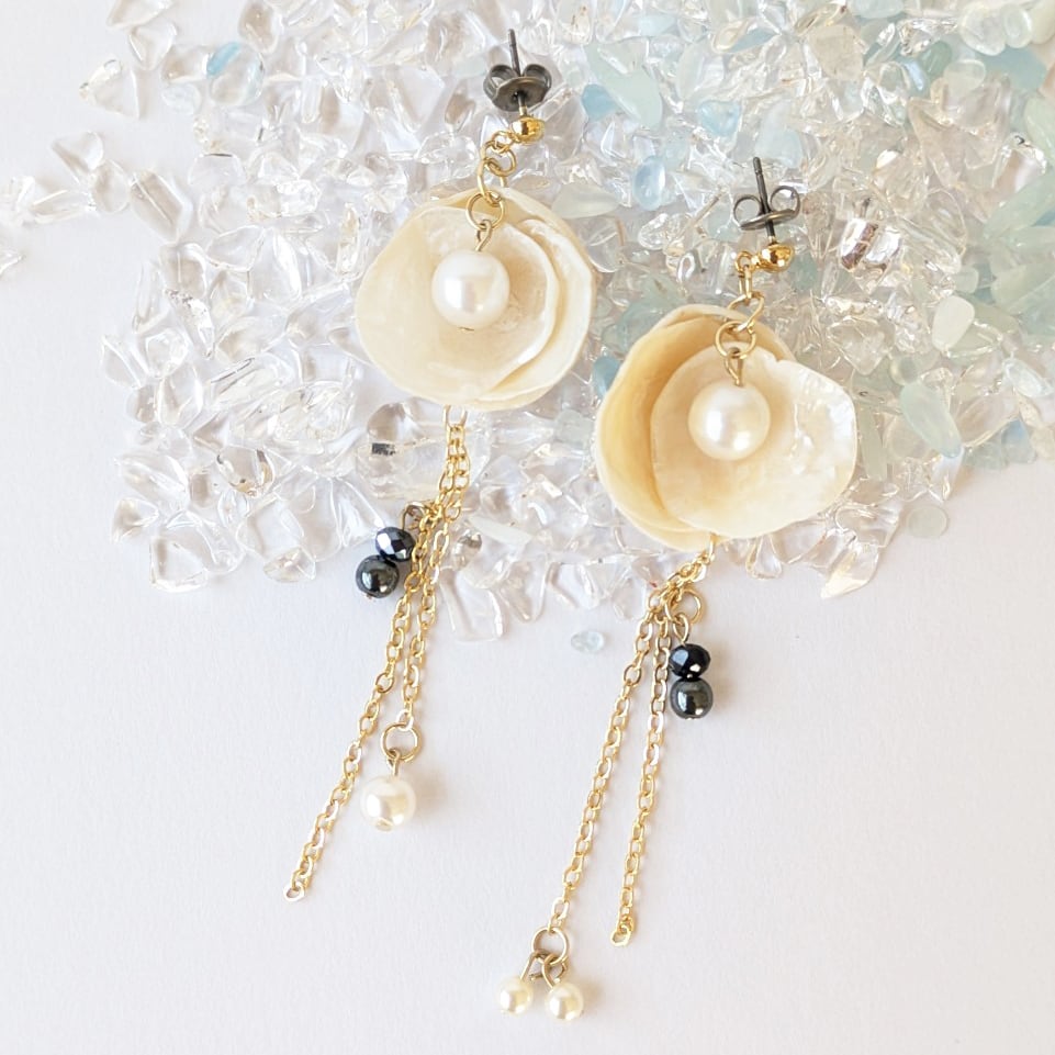 天然ナミマガシワの貝殻を花びらのように重ねたロングチェーンピアス。