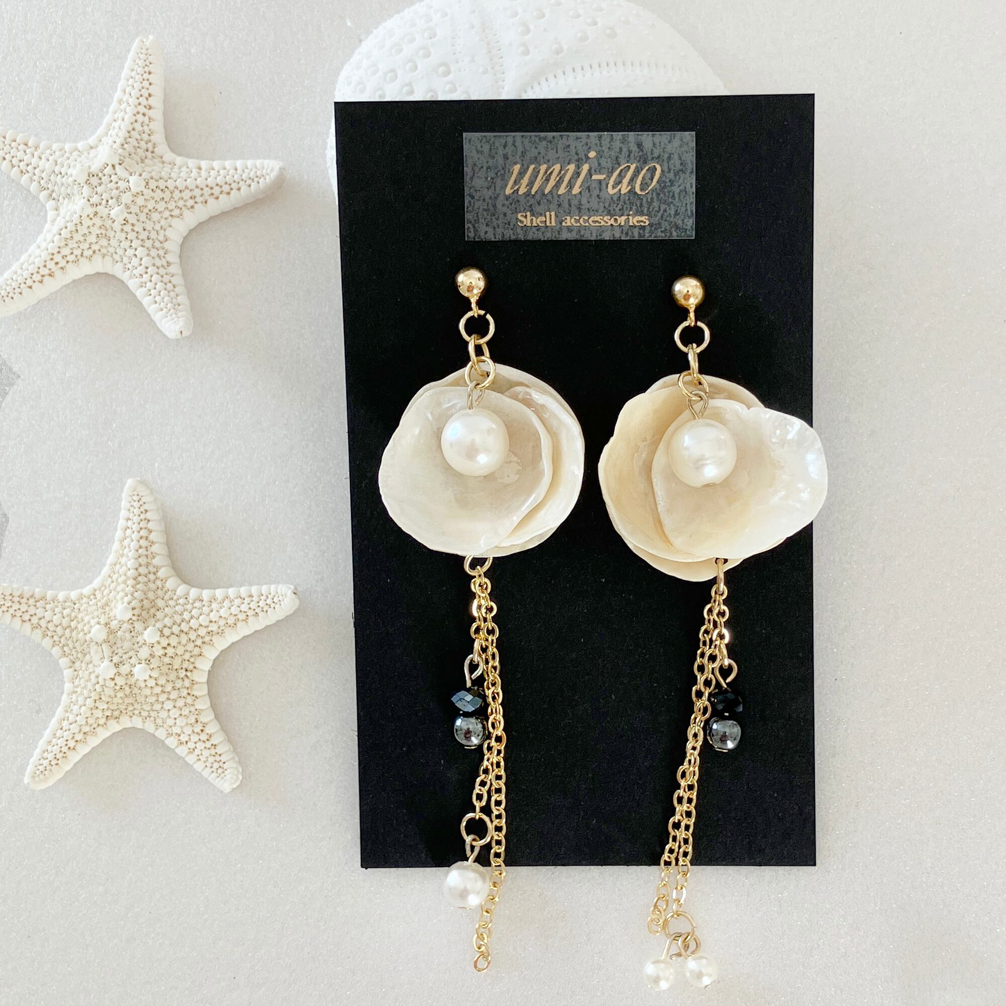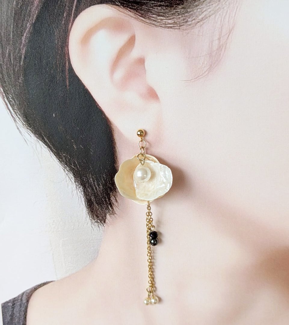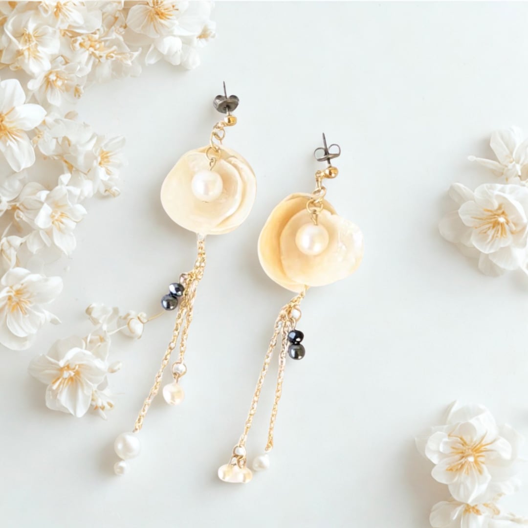 天然ナミマガシワの貝殻を花びらのように重ねたロングチェーンピアス。